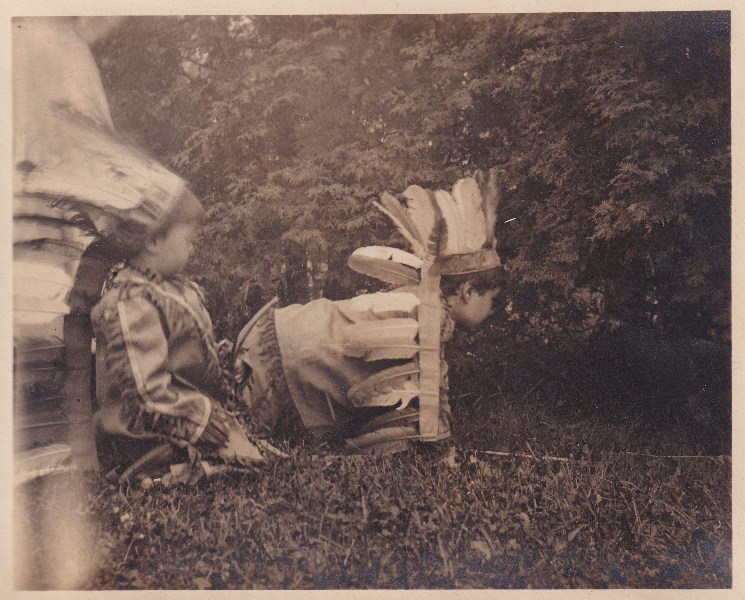 Photograph of a young John Dean Carrier (right) and an unidentified child wearing homemade Native American costumes while playing in the grass. John is on all fours and peering under a bush.Photograph Details
