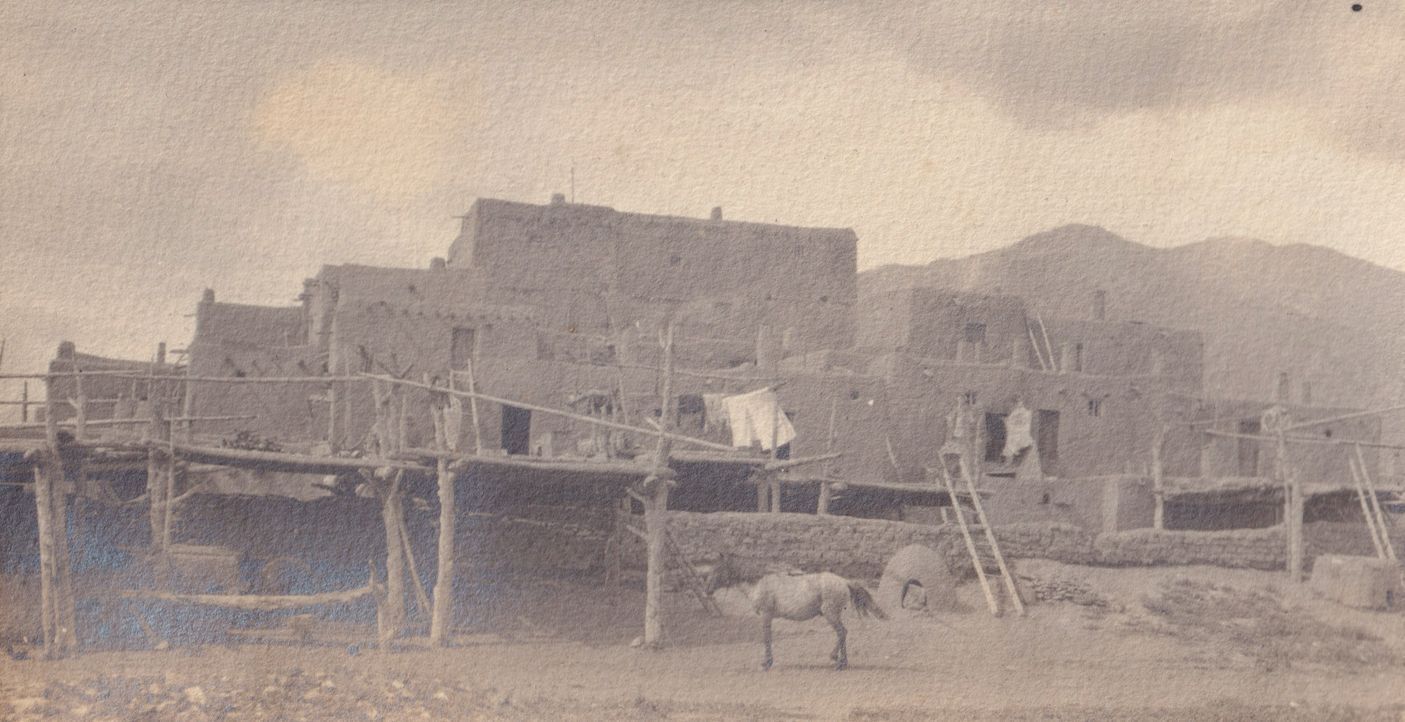 Black-and-white photograph of many adobe buildings, part of Taos Pueblo in New Mexico. There is a very small horse at the front of the fence outside of the buildings.