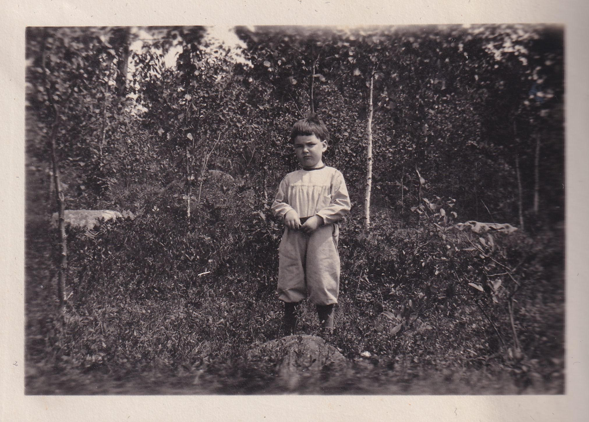 Photograph of a young John Dean Carrier standing on a rock in a wooded area.