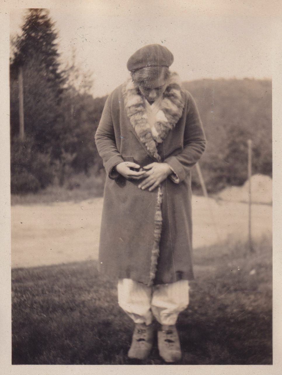 Black-and-White photograph of an unidentified woman, possibly Molly Danforth Guthrie, standing outside in a fur-lined coat.