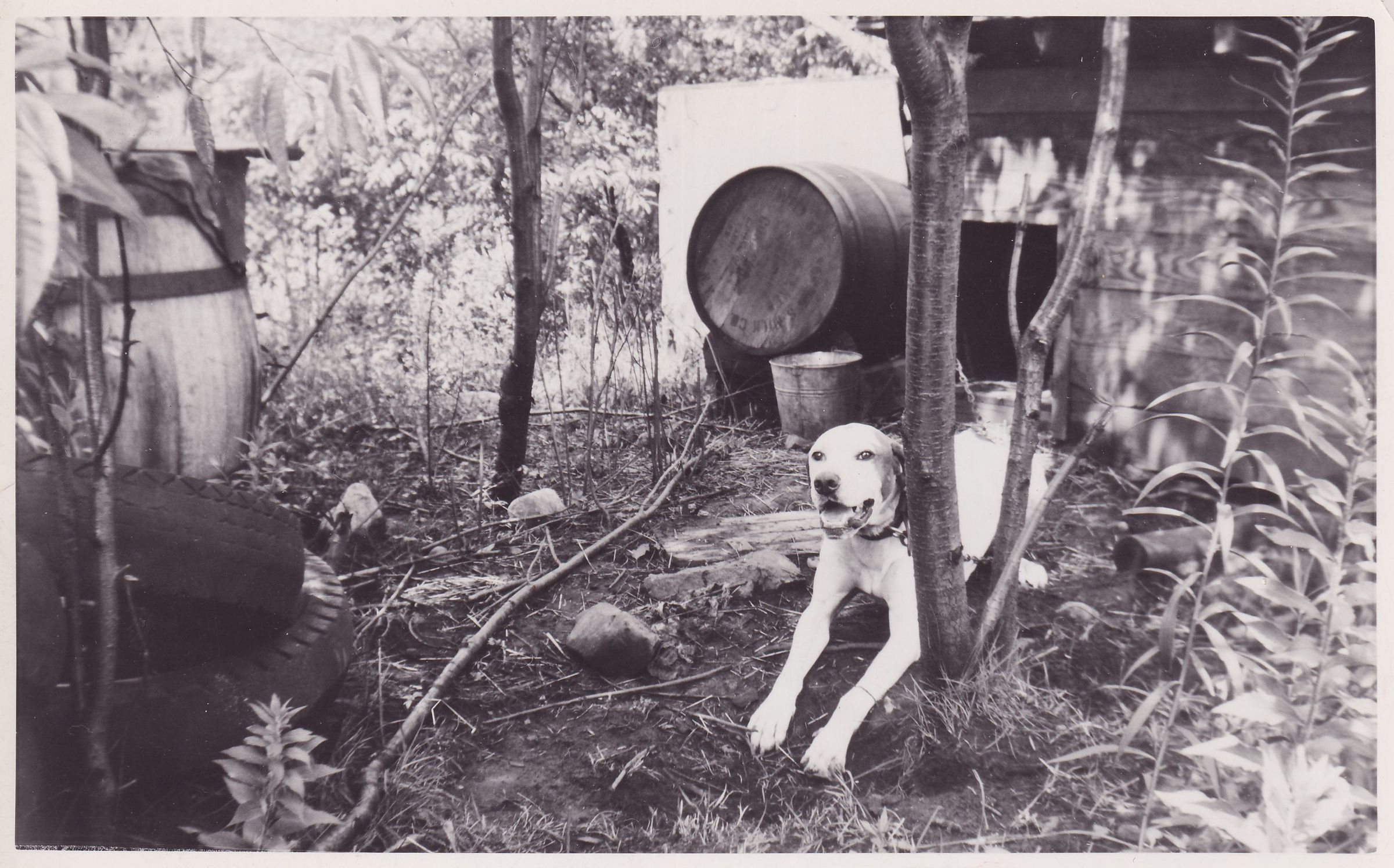 Black-and-White photograph of a leashed dog laying on the ground outside a wooden doghouse. There are piles of tires and barrels nearby.