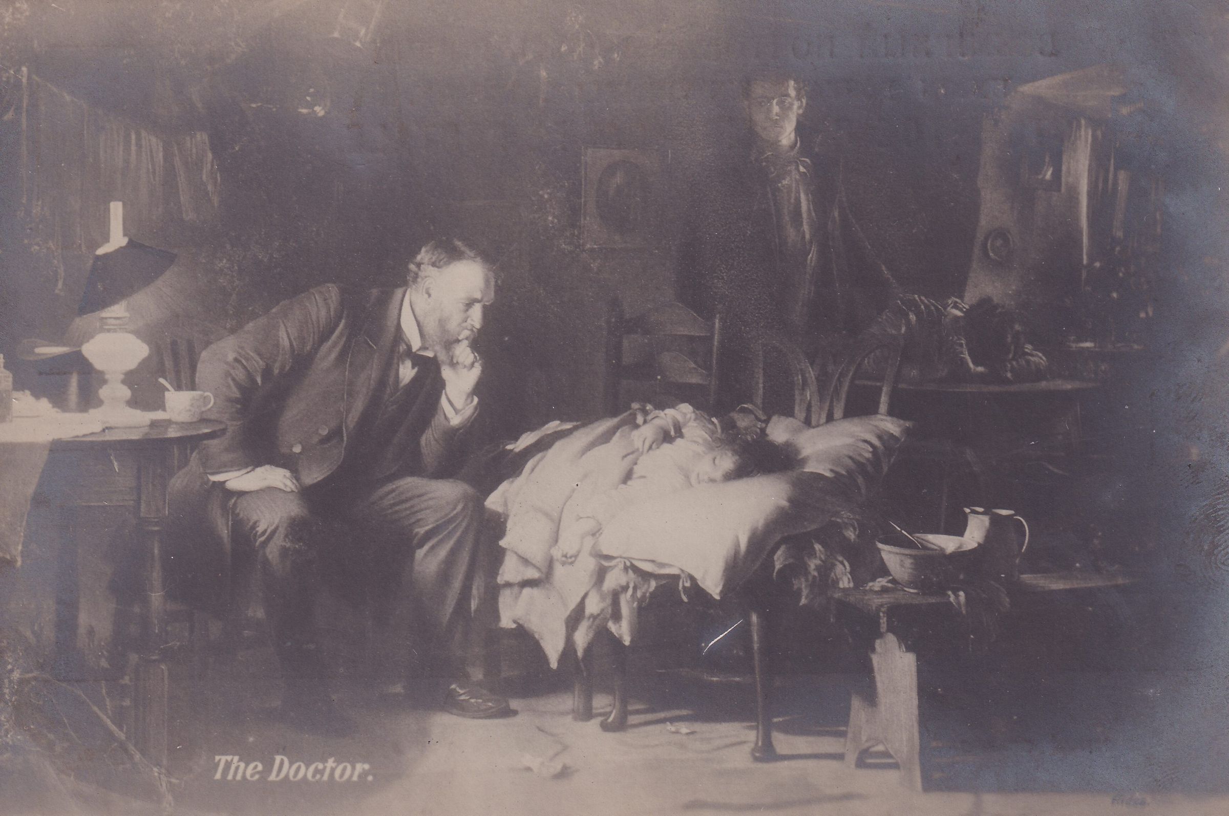 Black-and-White photograph postcard with image of a doctor sitting by a young patient’s bedside. Printed caption on front reads, “The Doctor.” Printing on reverse is in Ukrainian and Russian.