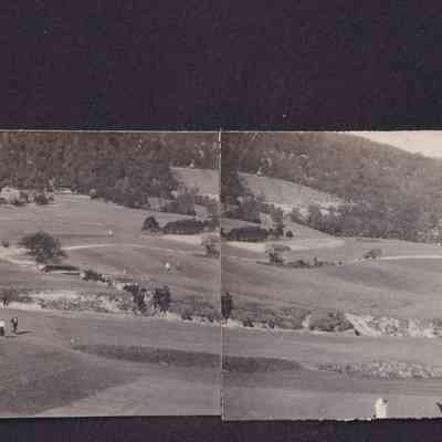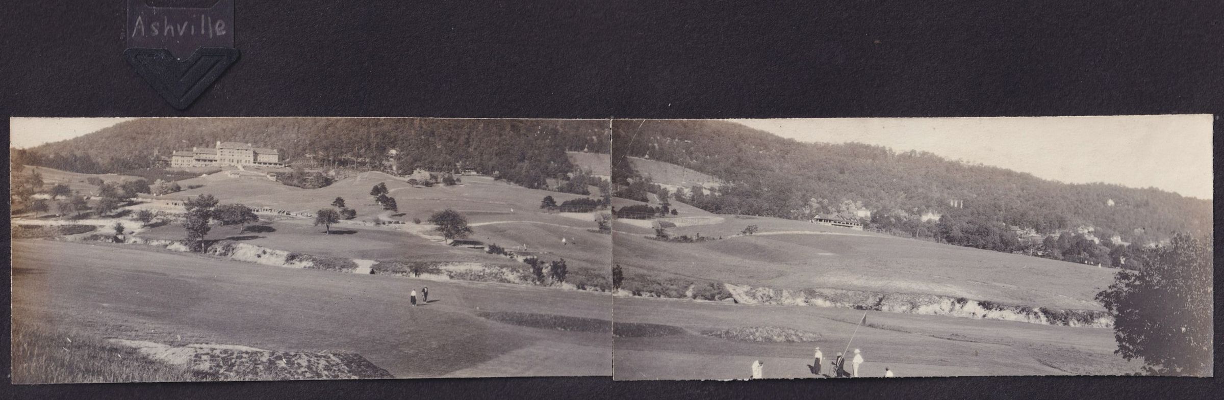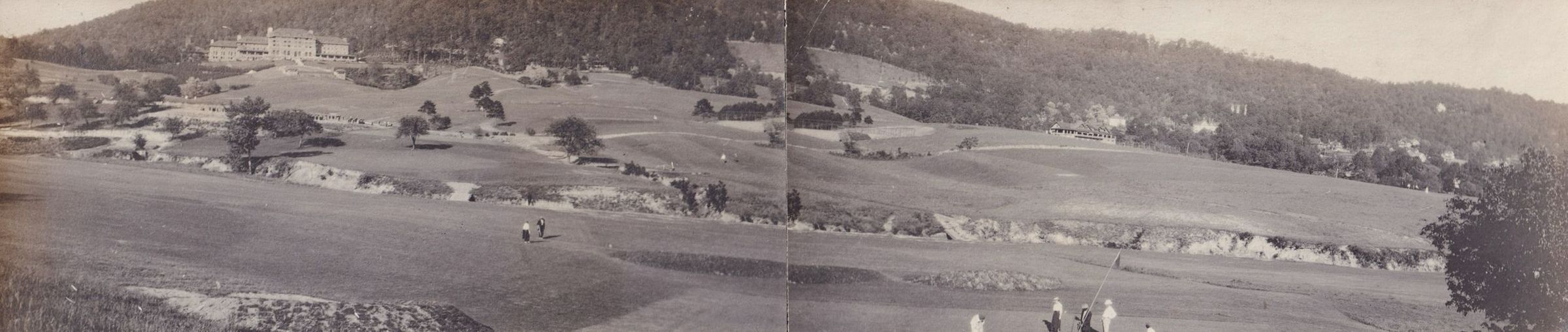 Two long black-and-white photographs put together of a golf course in Asheville, North Carolina. There is a large building, the Grove Park Inn, in the background on the left.