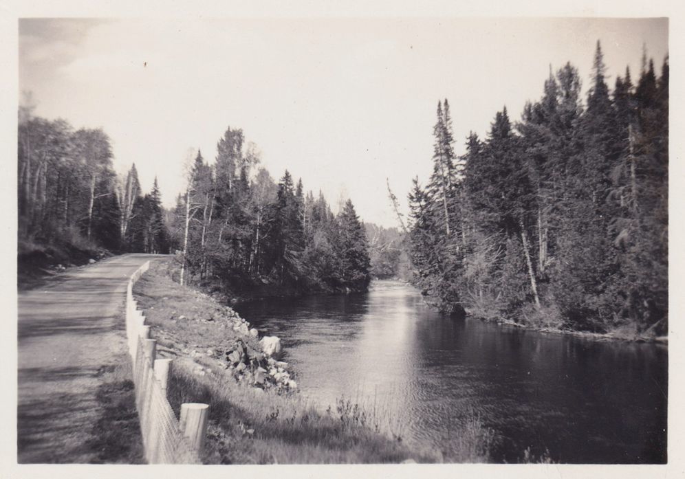 Black-and-White photograph of a stretch of Bloomingdale Avenue/State Route 3 along the Saranac River. The photograph was likely printed by Kollecker's Kodak and Gift Shop.