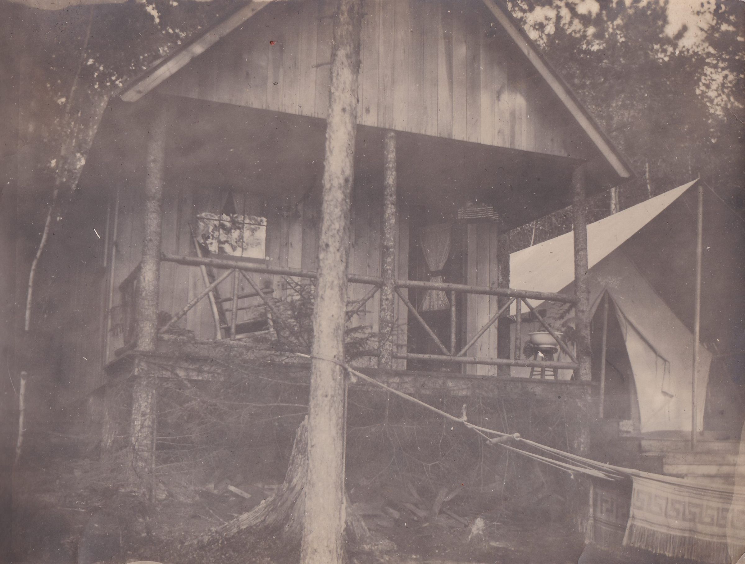 Photograph of an unidentified small camp building with a front porch. There is a platform tent visible behind the building, and a hammock hanging from trees in front.