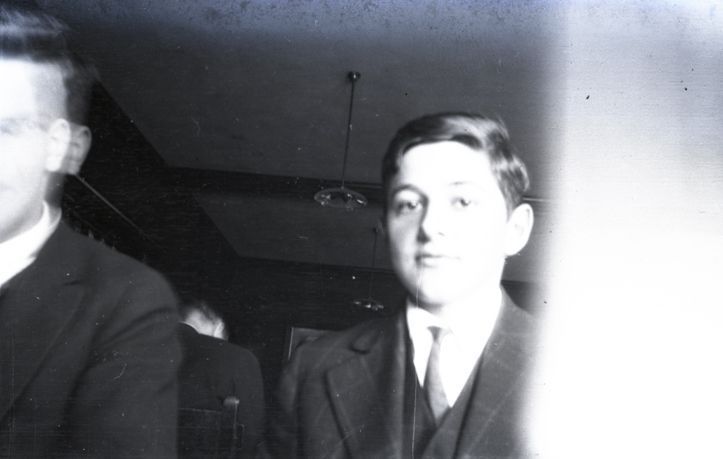 Negative of an unidentified young man wearing a suit. There is another young man next to him, mostly out of frame. Most likely taken by Mary Ives Baldwin. This item is not fully cataloged but has been uploaded so the image is publicly available; if you would like us to prioritize cataloging this item, please contact the HSL Collections team.