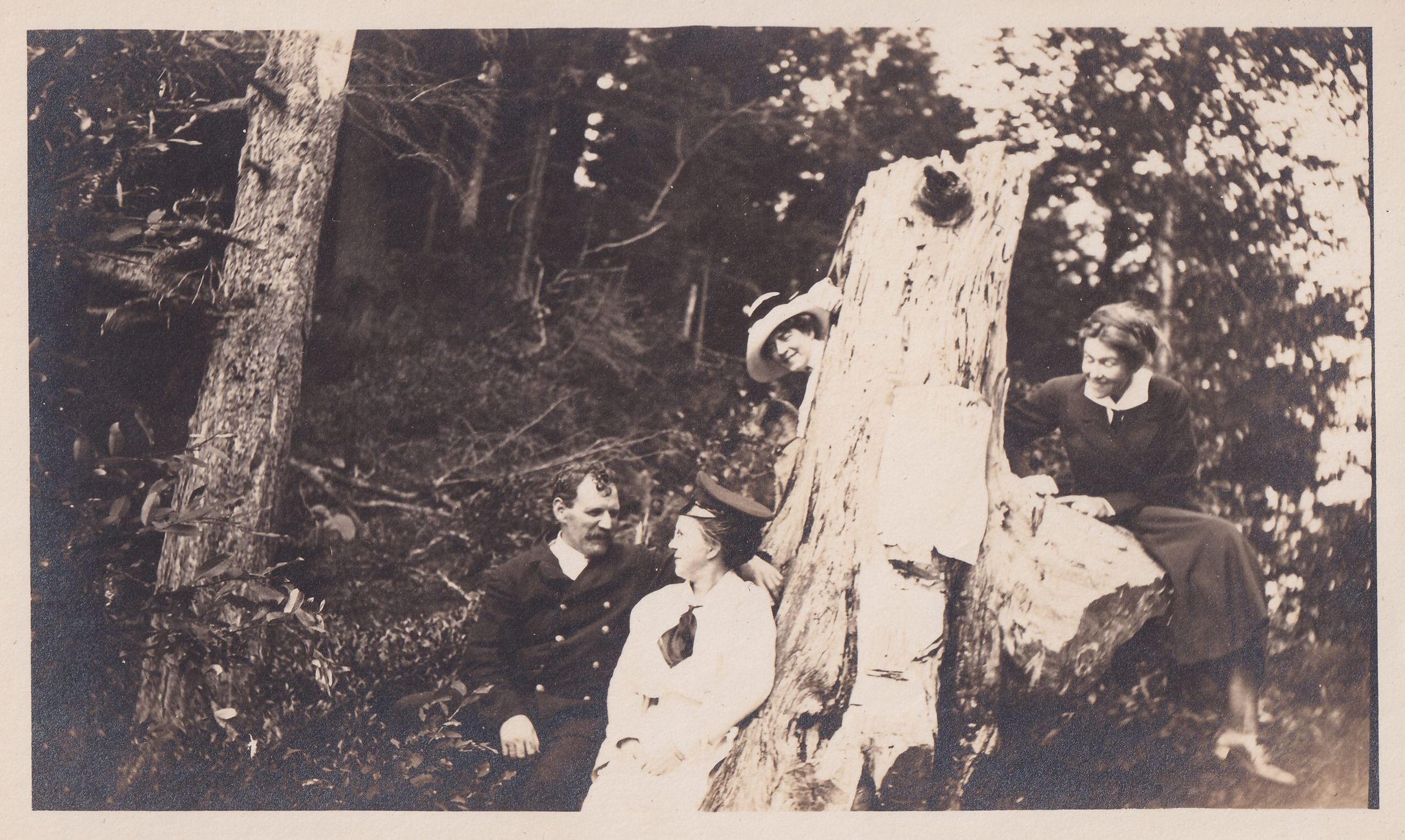 Photograph of a group of unidentified people seated on and around a large tree stump.