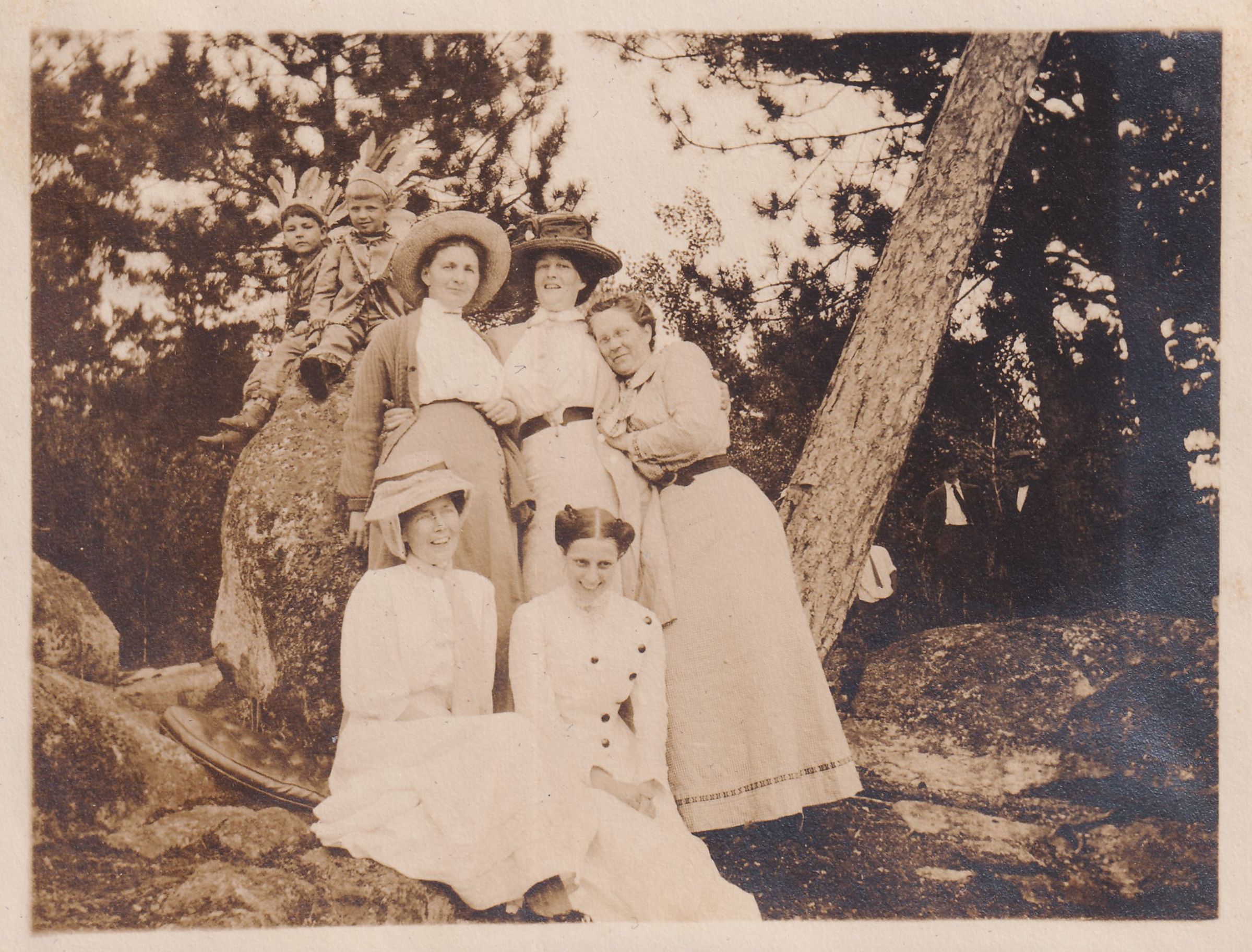 Photograph of a group of people seated on and standing around a large rock in the woods. Mary Ellen Carrier is standing at right, and John Dean Carrier is seated on the rock at left behind her. The rest of the people are unidentified. Two of the children are wearing homemade Native American costumes, including John Dean.Photograph Details