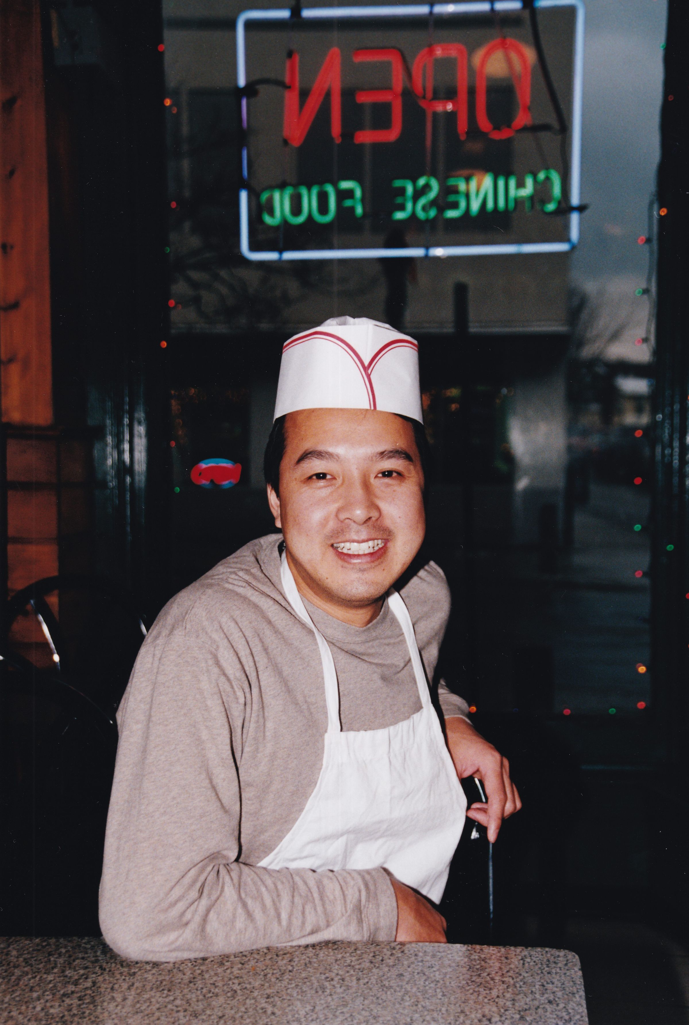 Color photograph of Zhi-ng Guo An sitting inside of his business, China Jade. Portrait taken by Mary Lou Hanpeter Banks as part of her Soul Proprietor exhibition.