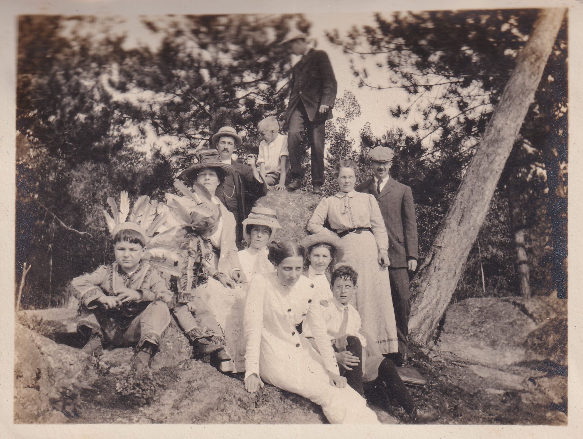 Photograph of a group of people seated on and standing around a large rock in the woods. Jack Carrier is standing at left in the back row. Mary Ellen Carrier is standing second from right. John Dean Carrier is seated at front left. The rest of the people are unidentified. Two of the children are wearing homemade Native American costumes, including John Dean.Photograph Details