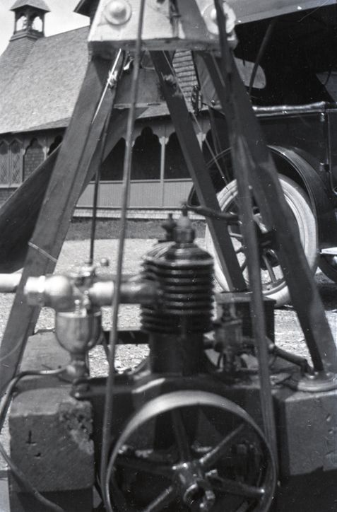Negative of a motor attached to a propeller, taken in the yard between the Baldwin House and the Church of St. Luke. There is also a car in frame next to the propeller setup. Most likely taken by Mary Ives Baldwin. This item is not fully cataloged but has been uploaded so the image is publicly available; if you would like us to prioritize cataloging this item, please contact the HSL Collections team.
