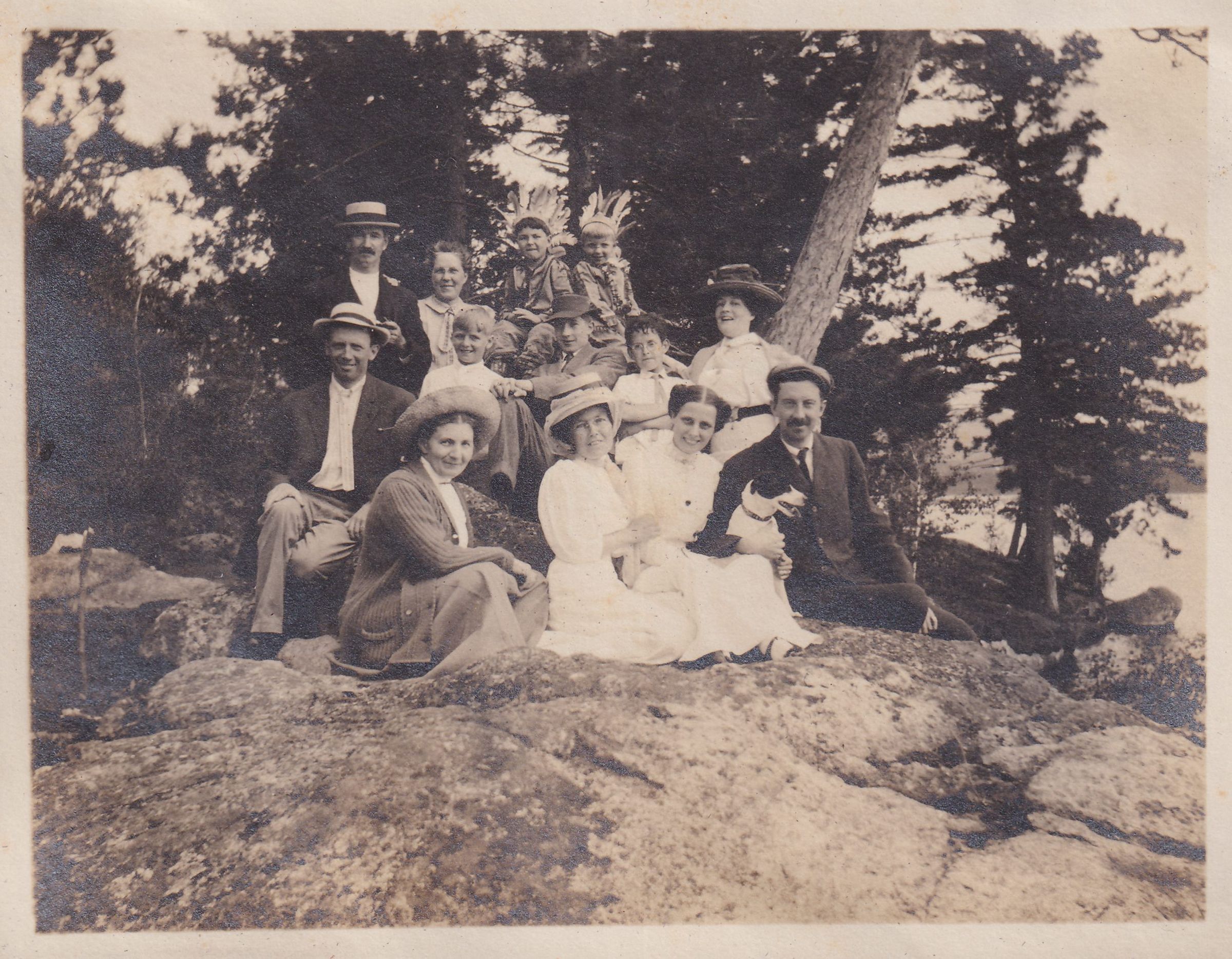 Photograph of a group of people seated on a large rock in the woods. Jack Carrier is standing second from left, with his wife Mary Ellen Carrier and their son John Dean Carrier next to him. The rest of the people are unidentified. Two of the children are wearing homemade Native American costumes, including John Dean. The rightmost man in the front row has his arm around a small dog.Photograph Details