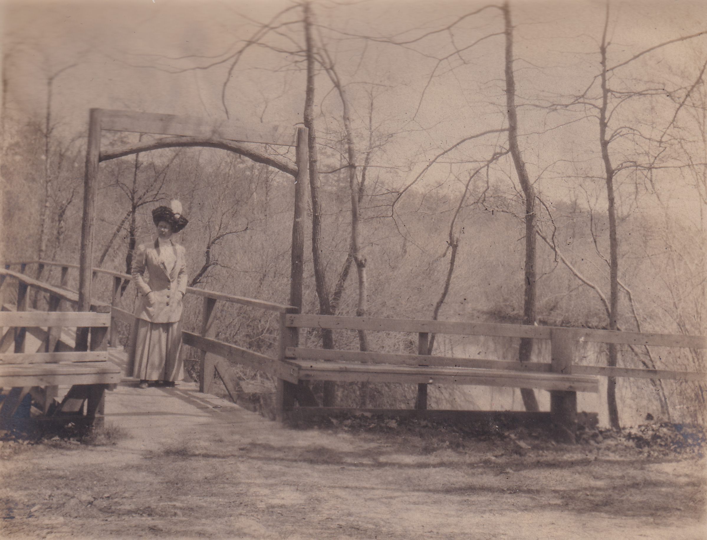 Photograph of a woman, possibly Mary Ellen Carrier, standing on a wooden bridge flanked with benches. There is an arched opening over the bridge.Photograph Details