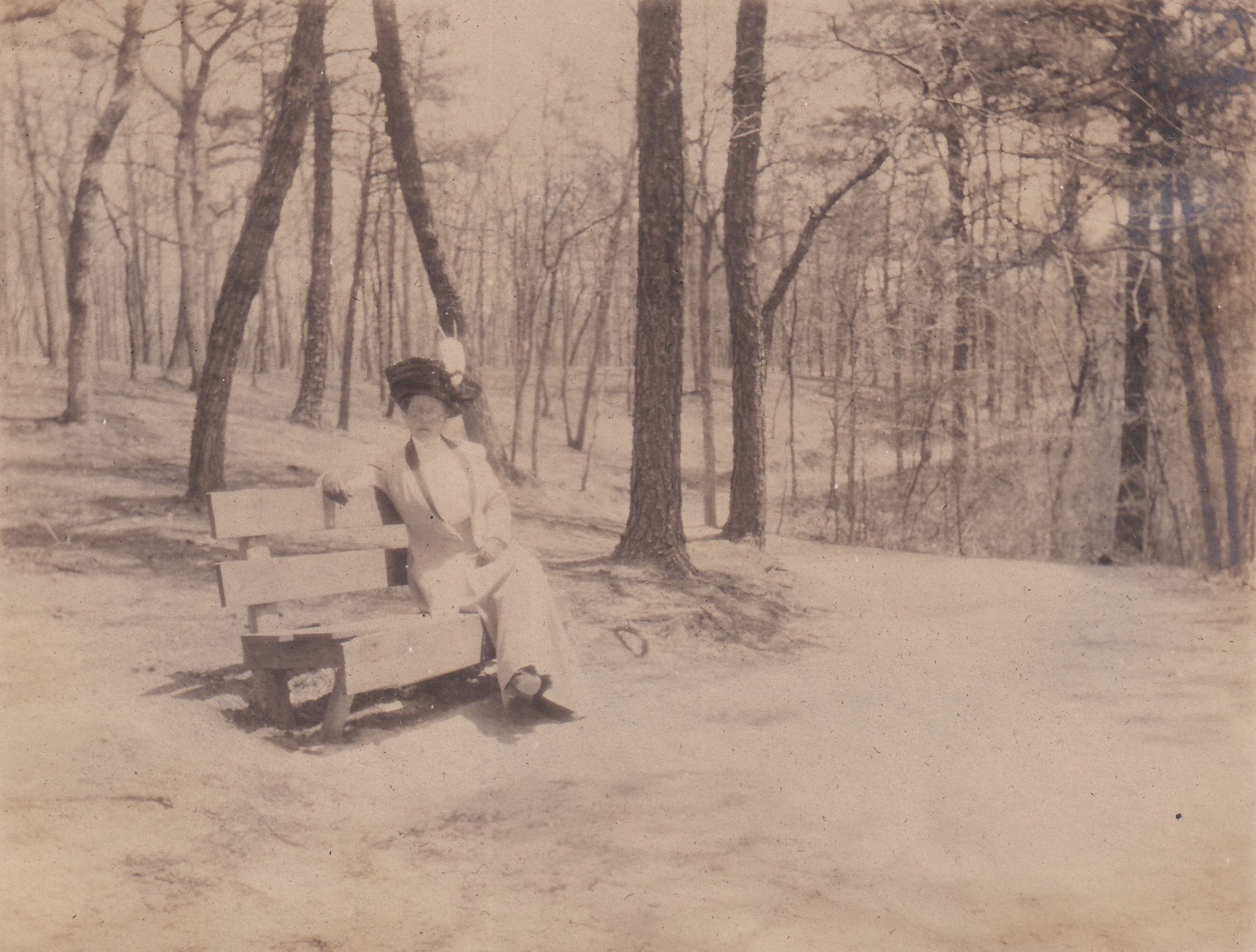 Photograph of a woman, possibly Mary Ellen Carrier, seated on a wooden bench along a path in the woods.
