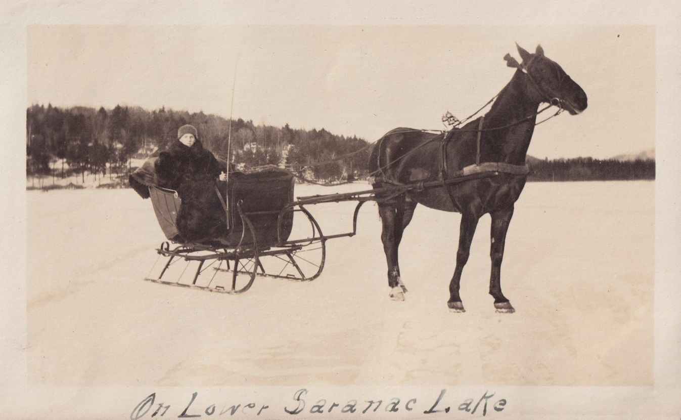 Black-and-white photograph of a man in a small horse-drawn sleigh. There is one horse hitched to the sleigh. They are on the ice and snow-covered surface of Lower Saranac Lake.