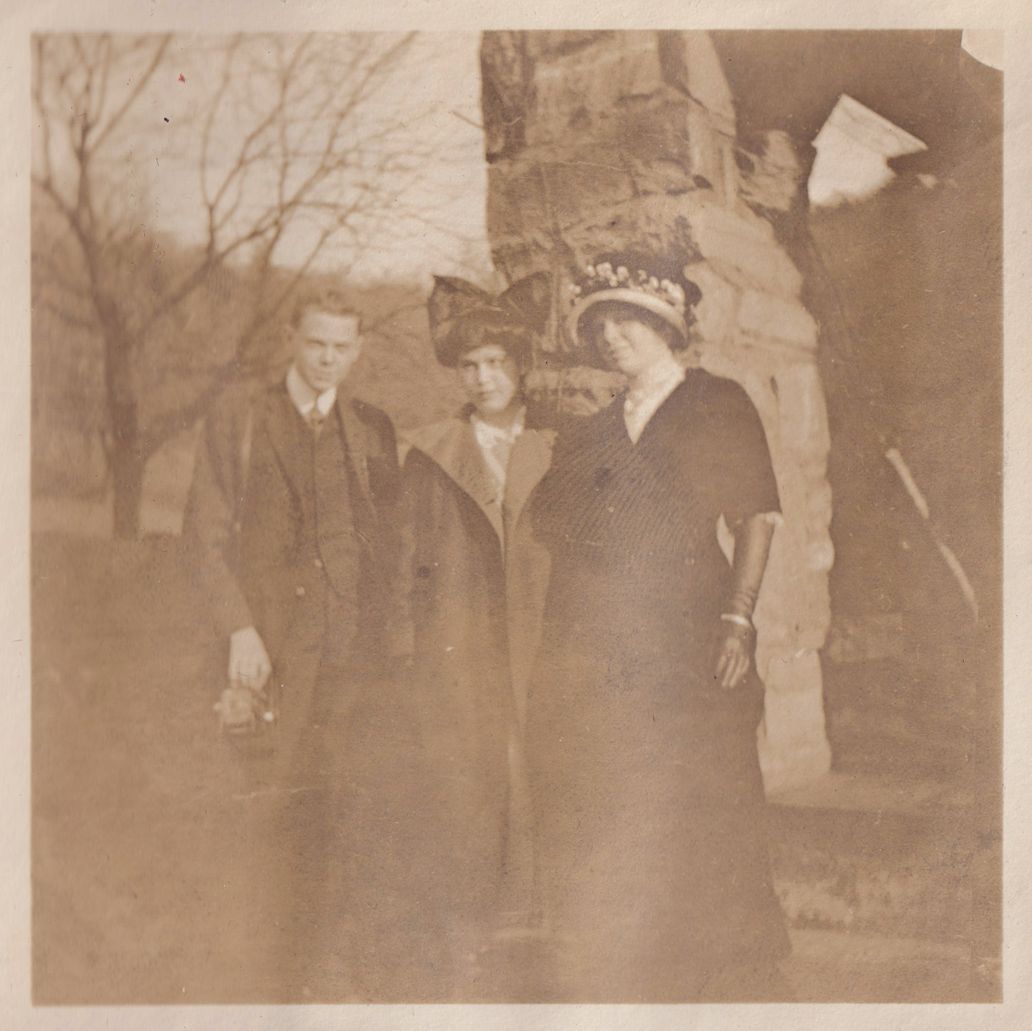 Black-and-white photograph of two women and one man standing together outside. There is a stone structure behind them.