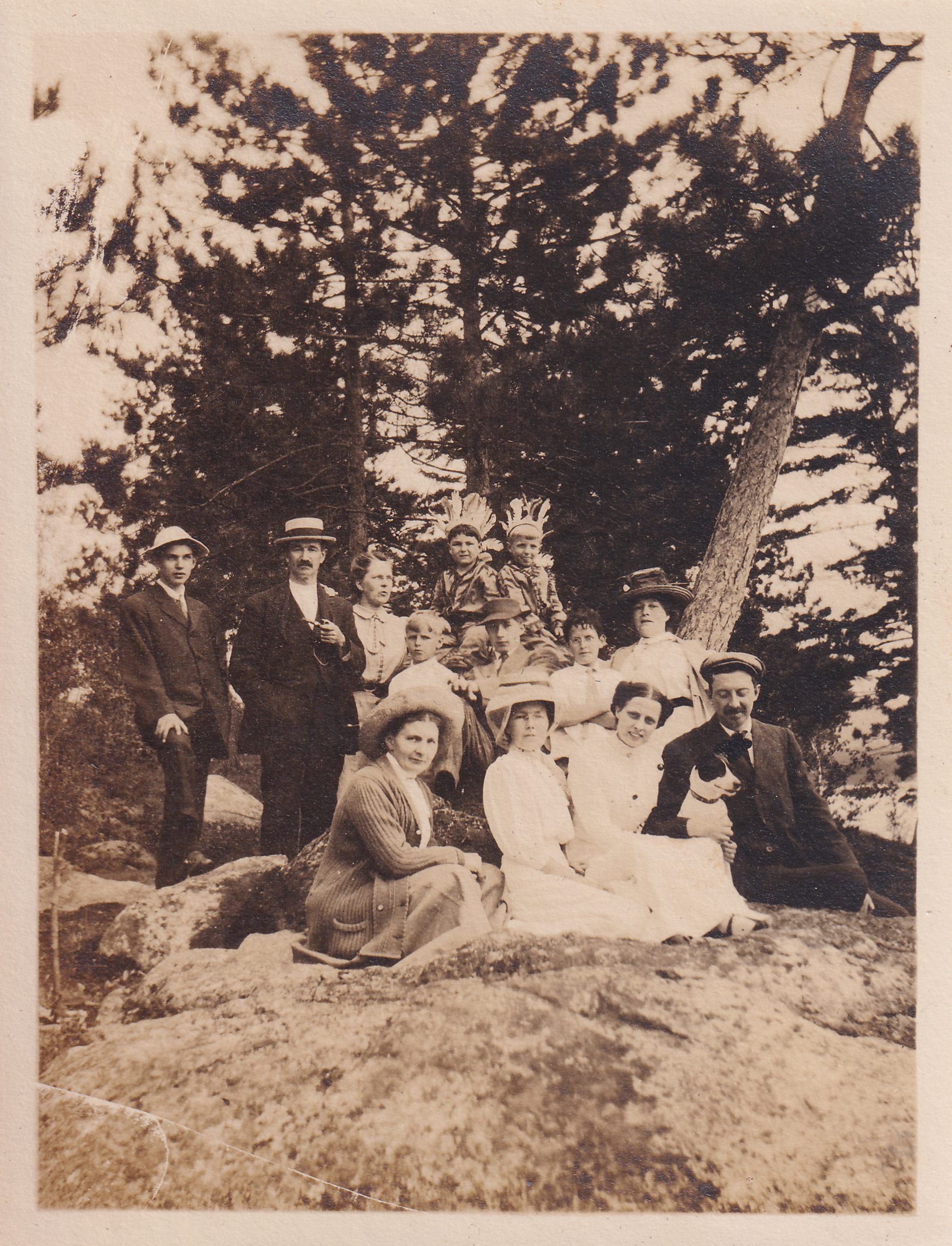 Photograph of a group of people seated on a large rock in the woods. Jack Carrier is standing second from left, with his wife Mary Ellen Carrier and their son John Dean Carrier next to him. The rest of the people are unidentified. Two of the children are wearing homemade Native American costumes, including John Dean. The rightmost man in the front row has his arm around a small dog.Photograph Details