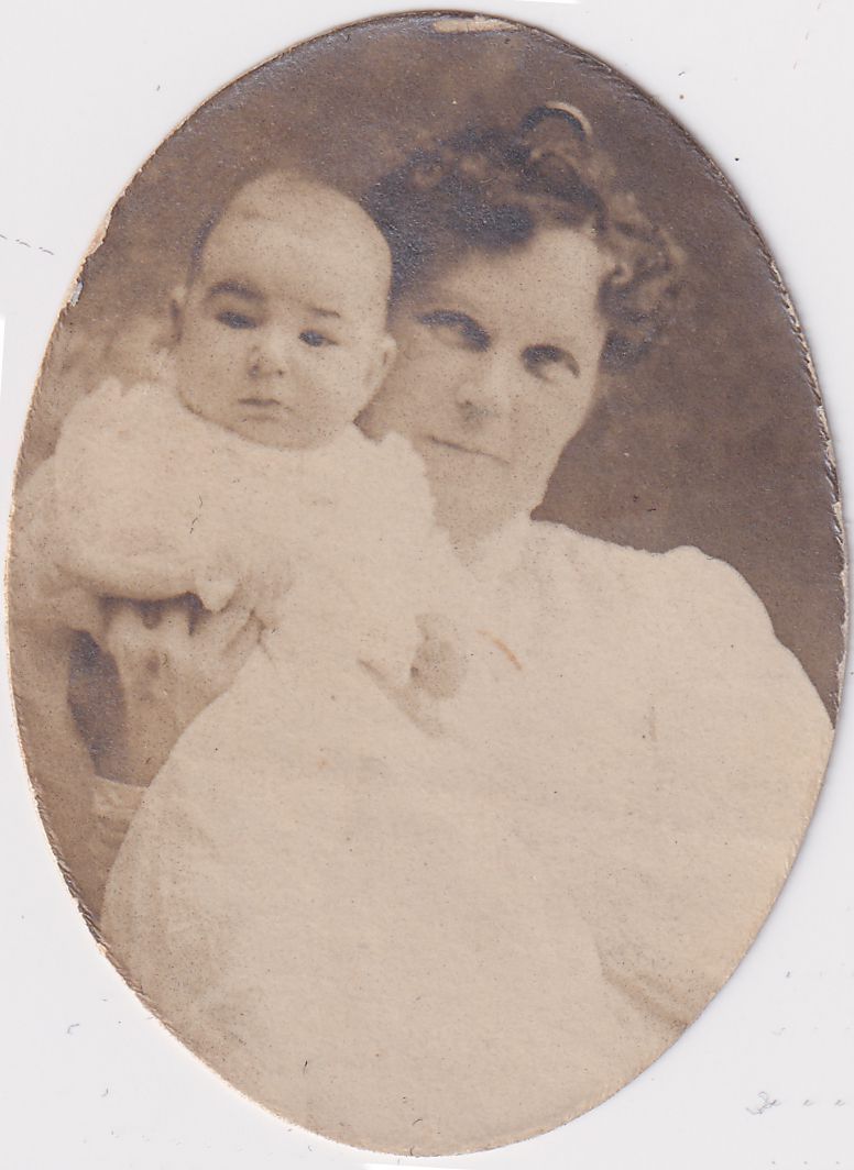 Small oval studio photograph of Mary Ellen Carrier holding an infant John Dean Carrier.