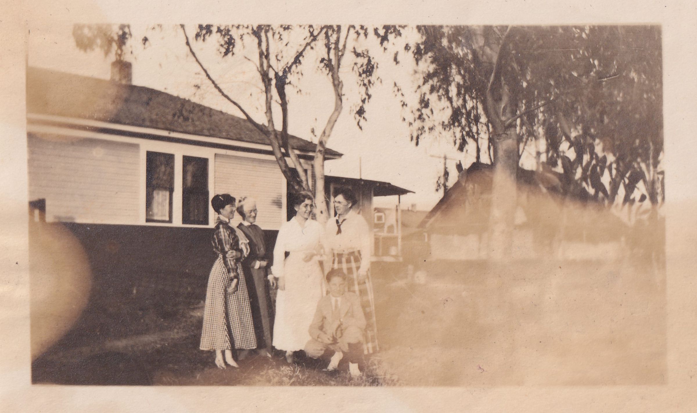 Photograph of a group of people standing near the side of a house. The woman standing at right is likely Mary Ellen Carrier and the boy squatting down in front of her is likely John Dean Carrier. This photograph was likely taken in California, as the family moved there in 1912.Photograph Details