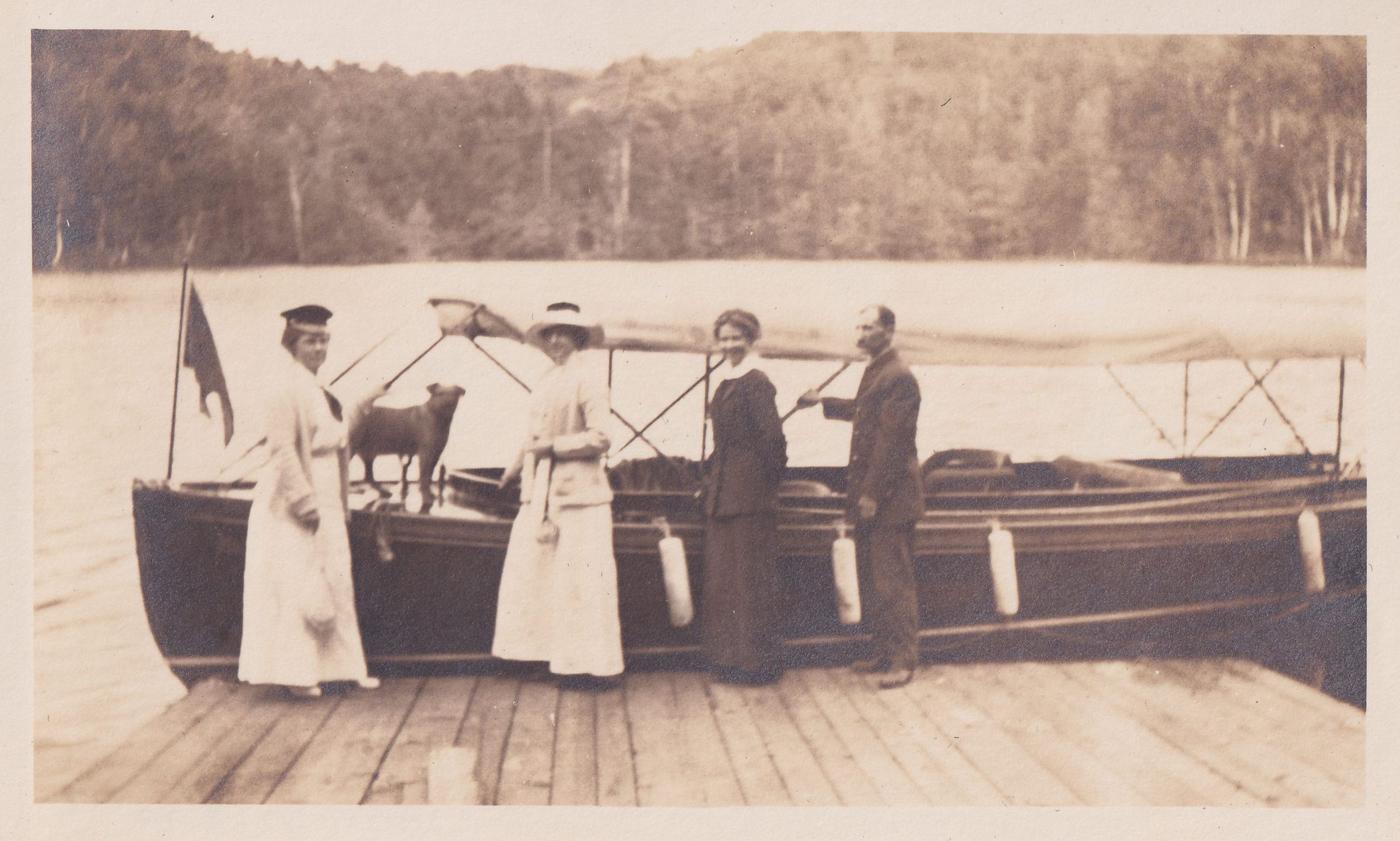 Photograph of a group of unidentified people standing on a dock alongside a large wooden boat. There is a dog standing on the bow of the boat.