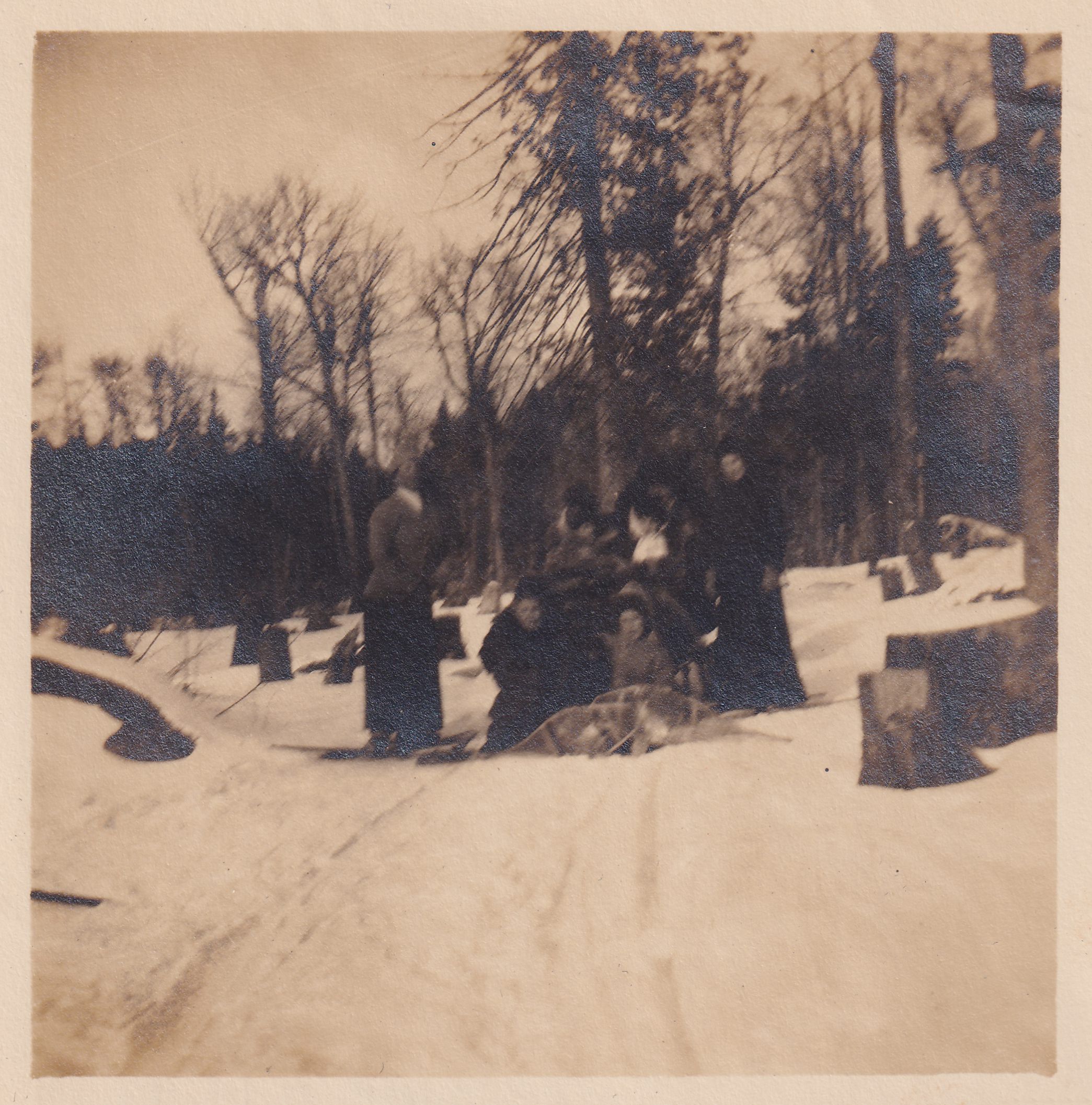 Photograph of a group of unidentified people in the snow in the woods. There is a pair of crossed snowshoes on the ground in front of them.
