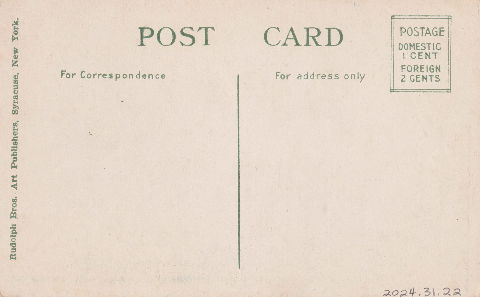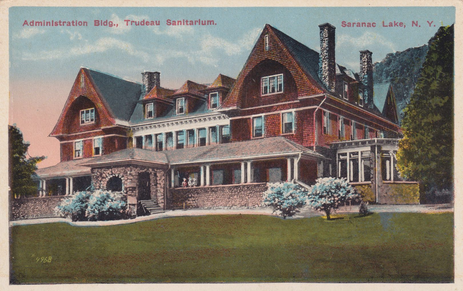 Color postcard showing the Main Building at Trudeau Sanatorium. Printed caption on front reads, "Administration Bldg., Trudeau Sanatorium." Printed by the Rudolph Bros. Art Publishers, Syracuse, NY. Unused, divided back, white border.Subject Place