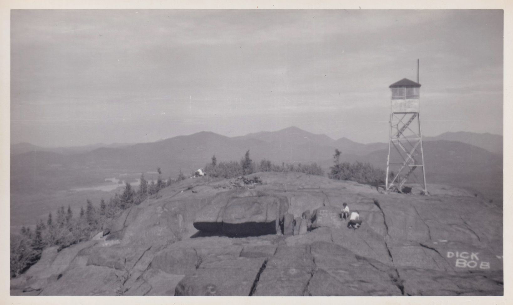 Black-and-White photograph showing a fire tower on top of a mountain. People can be seen sitting on the mountain, and "Dick" and "Bob" have been painted in large letters on one of the rocks. Handwritten message on reverse reads, "Pyramid Camp 1952. Top of Mt. Ampersand?"