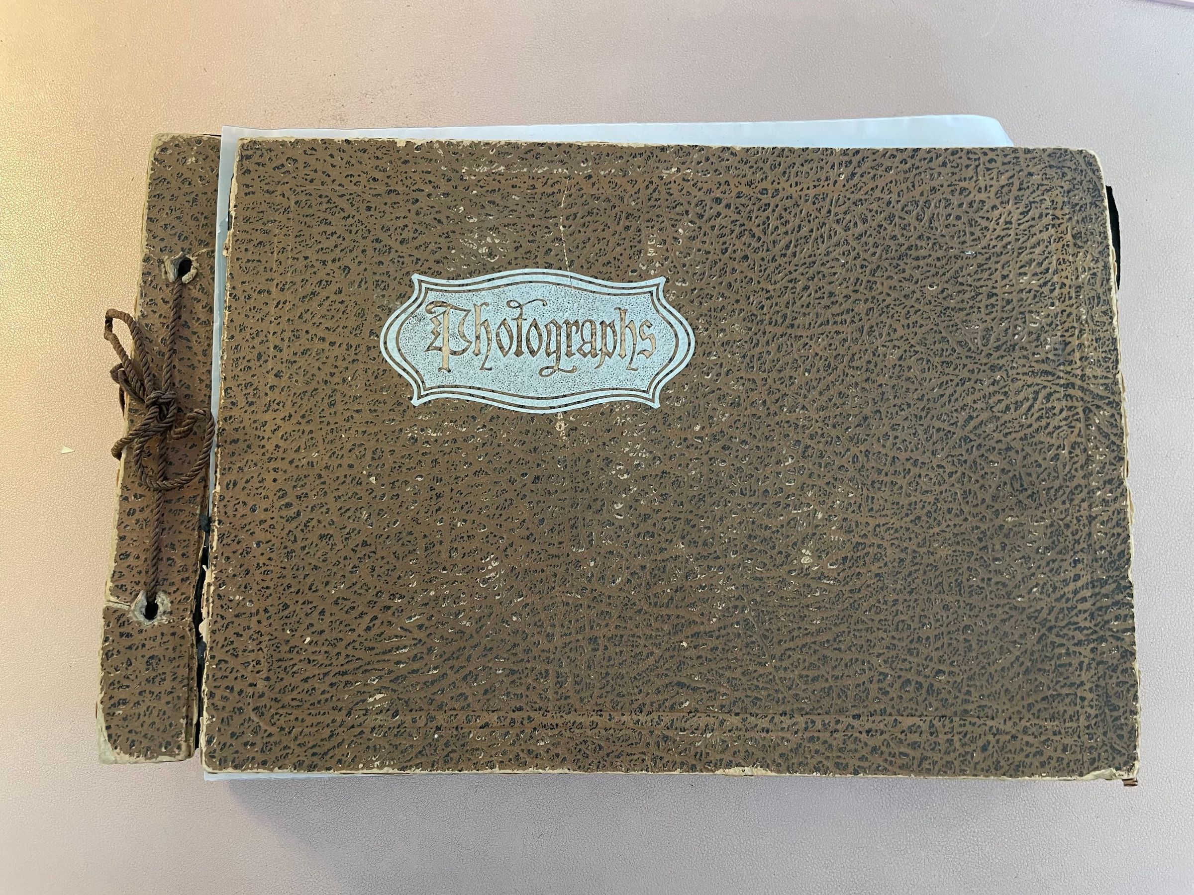 Bound with a string at left-hand side, with leather covers. Cover reads, "Photographs," and photographs are mounted on black paper inside. Some photographs and clippings have been tucked into covers, and some photographs have come loose from their pages.Photograph Details