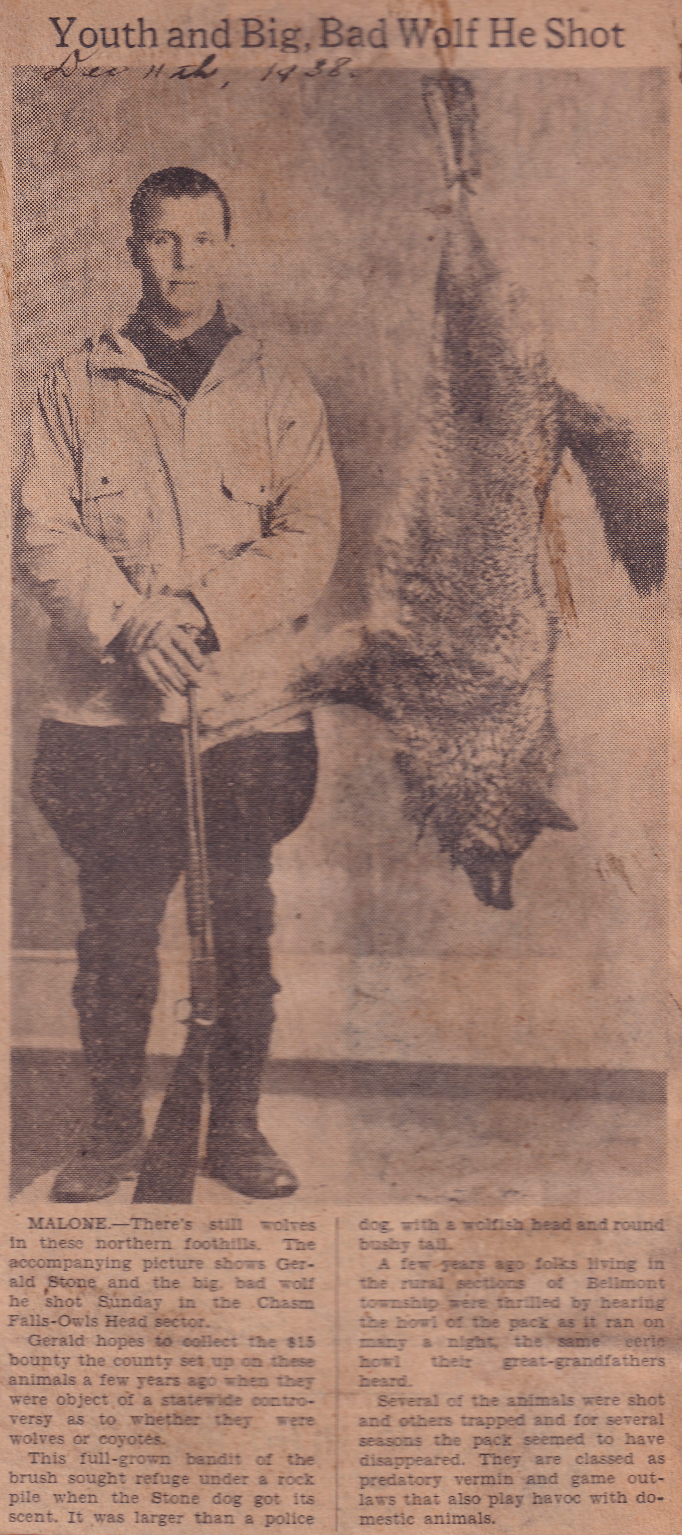 Newspaper clipping titled, "Youth and Big, Bad Wolf He Shot." Handwritten note at top reads, "December 11, 1938." Has photograph of Gerald Stone standing with his gun next to a wolf hanging from its hind feet. No newspaper identified. Glued inside front cover of album 2022.144.173.Lexicon