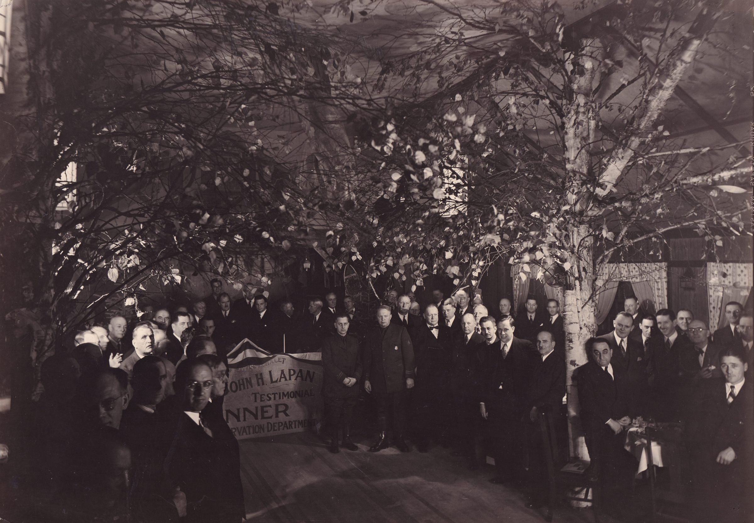 Photograph of a large group of people standing inside a room decorated with whole birch trees. There is a large sign on the floor in the middle of the photograph, which is partially blocked by people, but likely reads, "Birk's Swiss Chalet - John H. Lapan Testimonial Dinner, Conservation Department."Made/Created