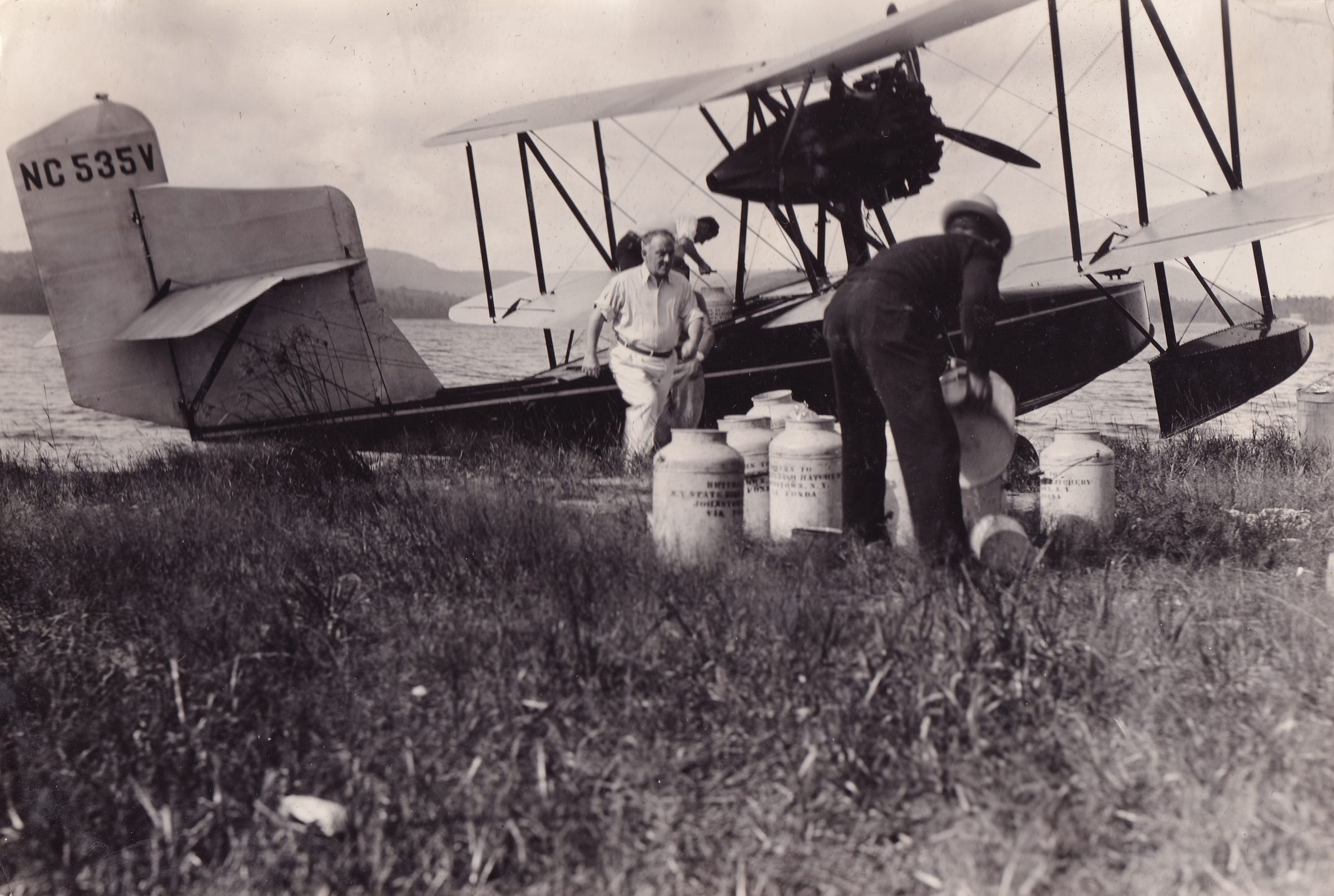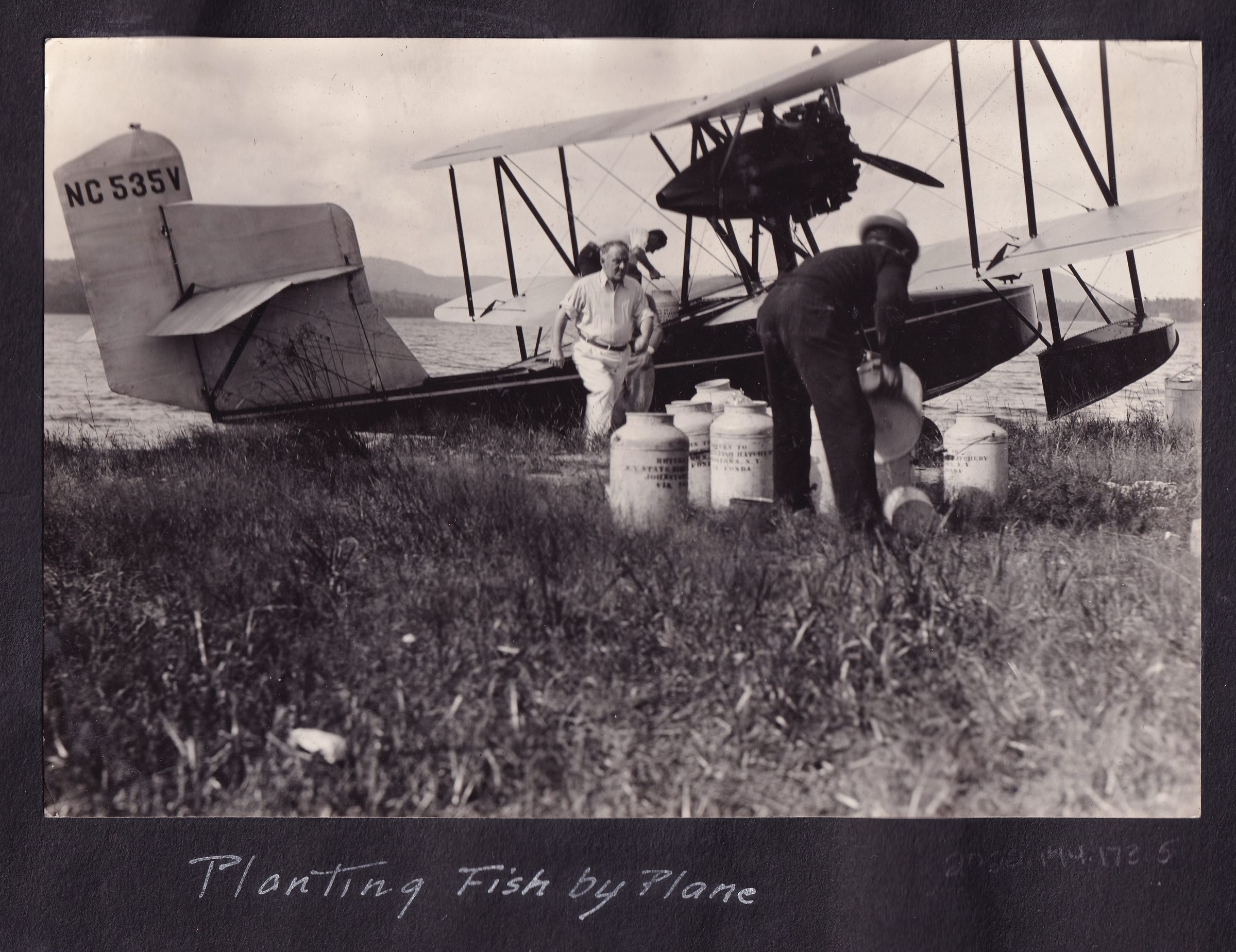 Photograph of three men loading large buckets onto a biplane. The tail of the plane is marked NC535V. Handwritten caption on page reads, "Planting Fish by Plane."