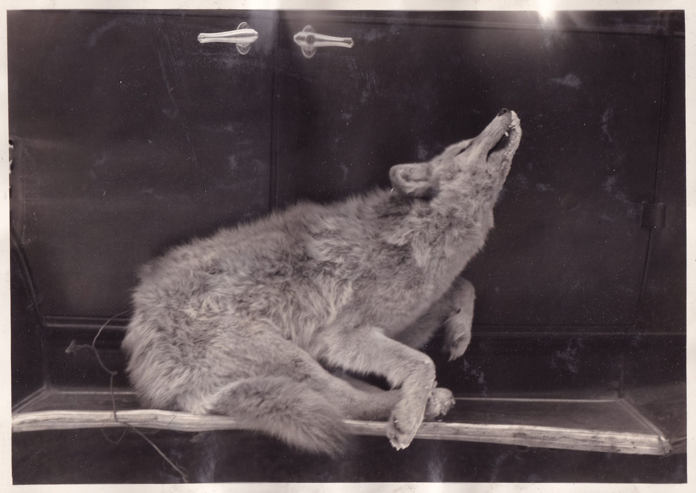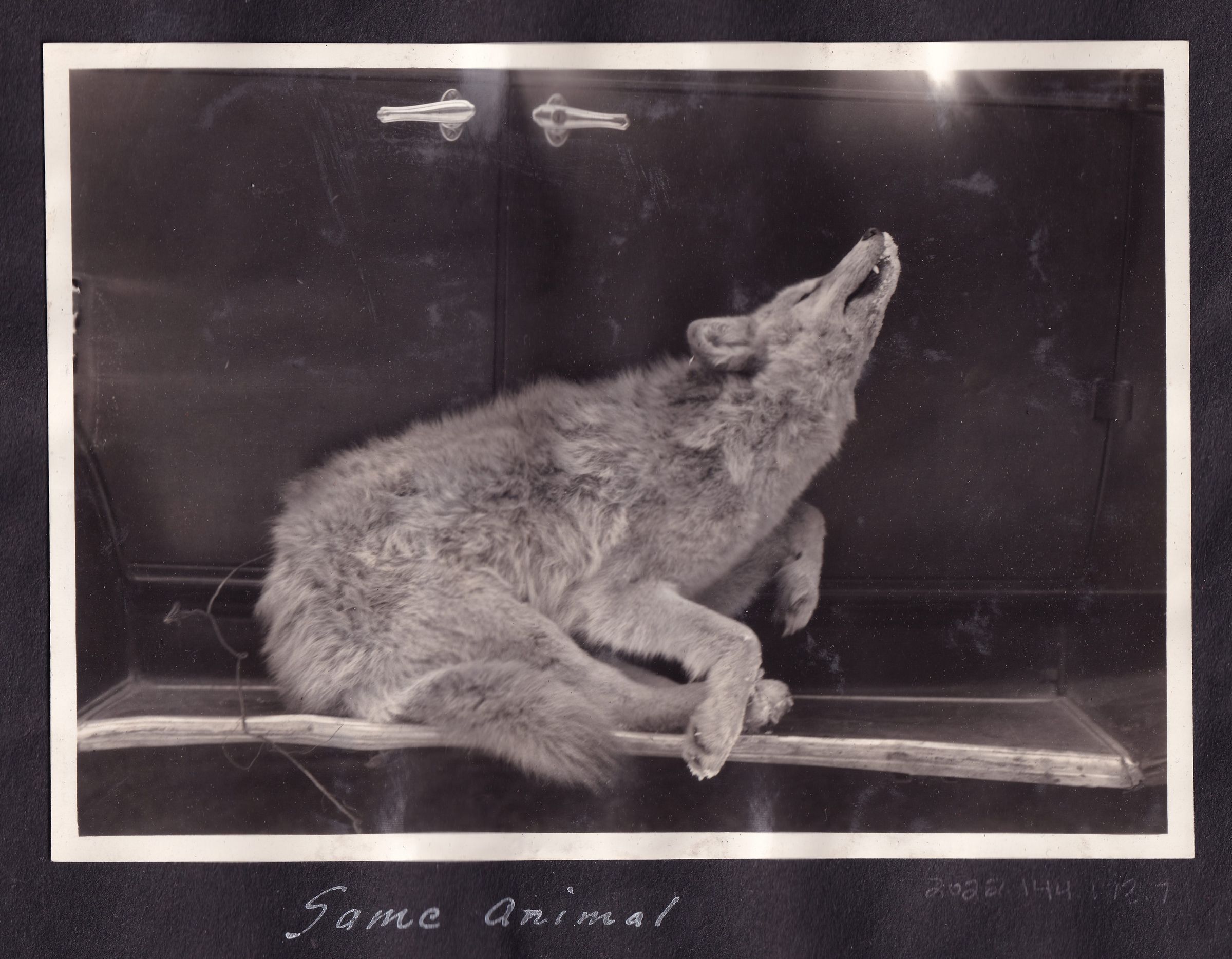 Photograph of a dead wolf. It is wrapped in wire and placed on the running board of an automobile. This is the same wolf as seen in 2022.144.173.6.