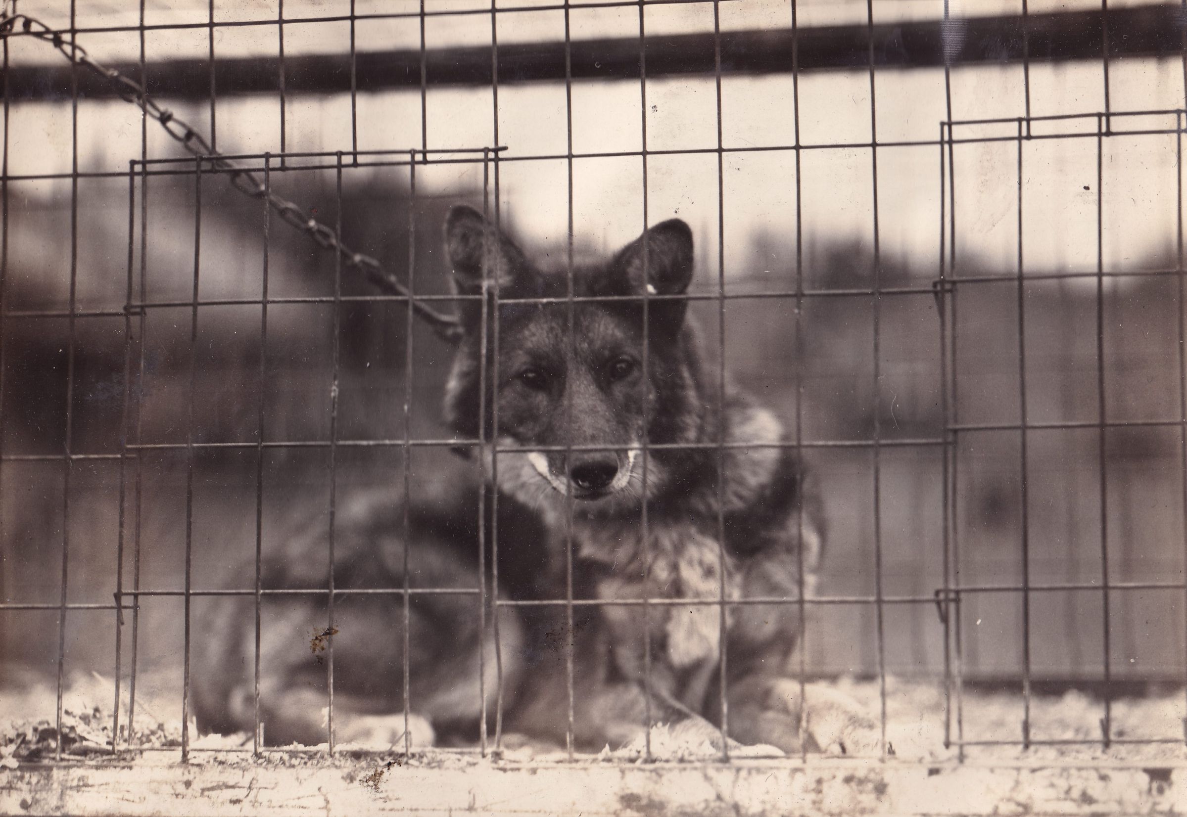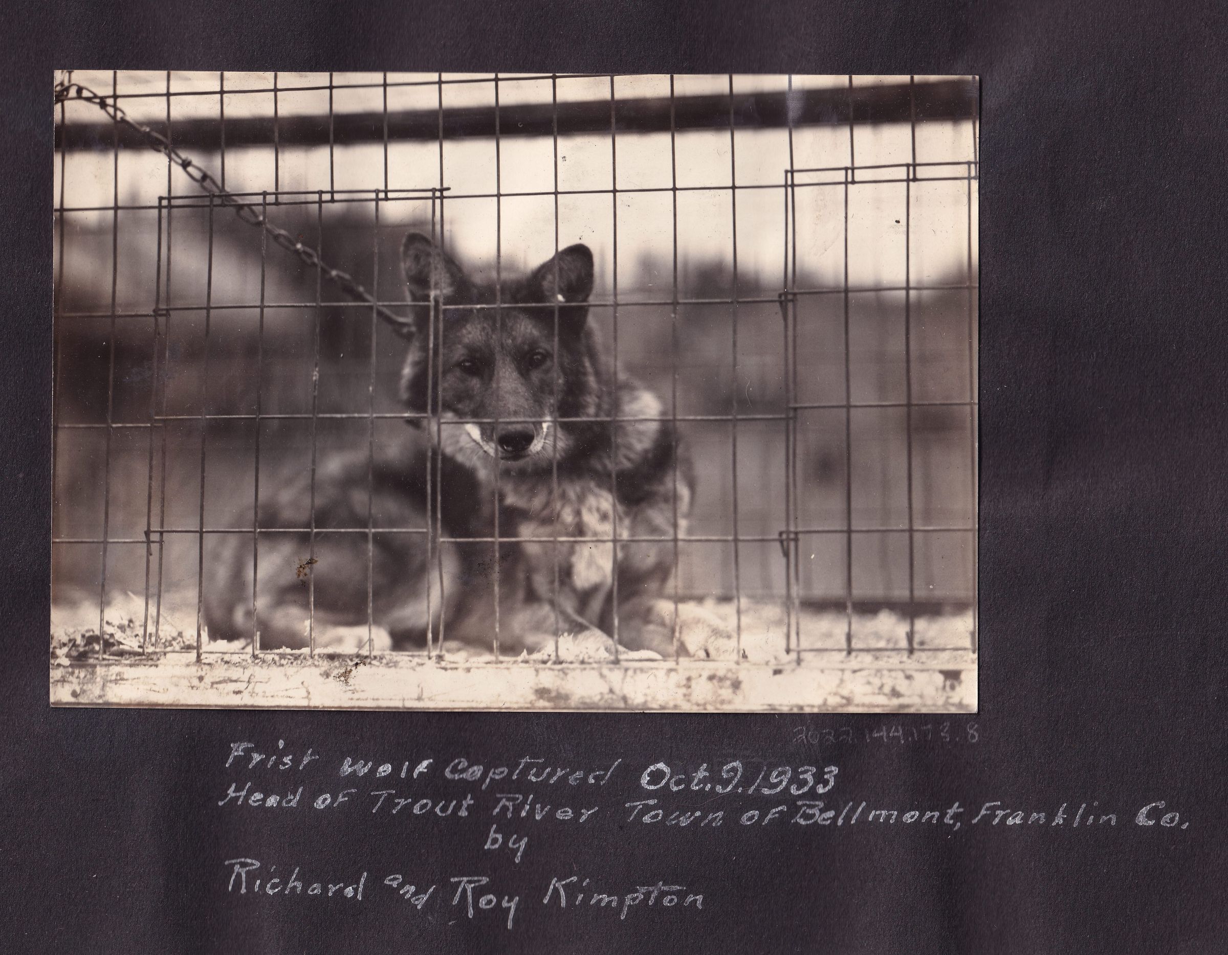 Photograph of a wolf in a cage. The wolf is attached to a taut chain. Handwritten caption under photograph reads, "Frist [sic] wolf captured Oct. 9, 1933. Head of Trout River Town of Bellmont, Franklin Co. by Richard and Roy Kimpton."