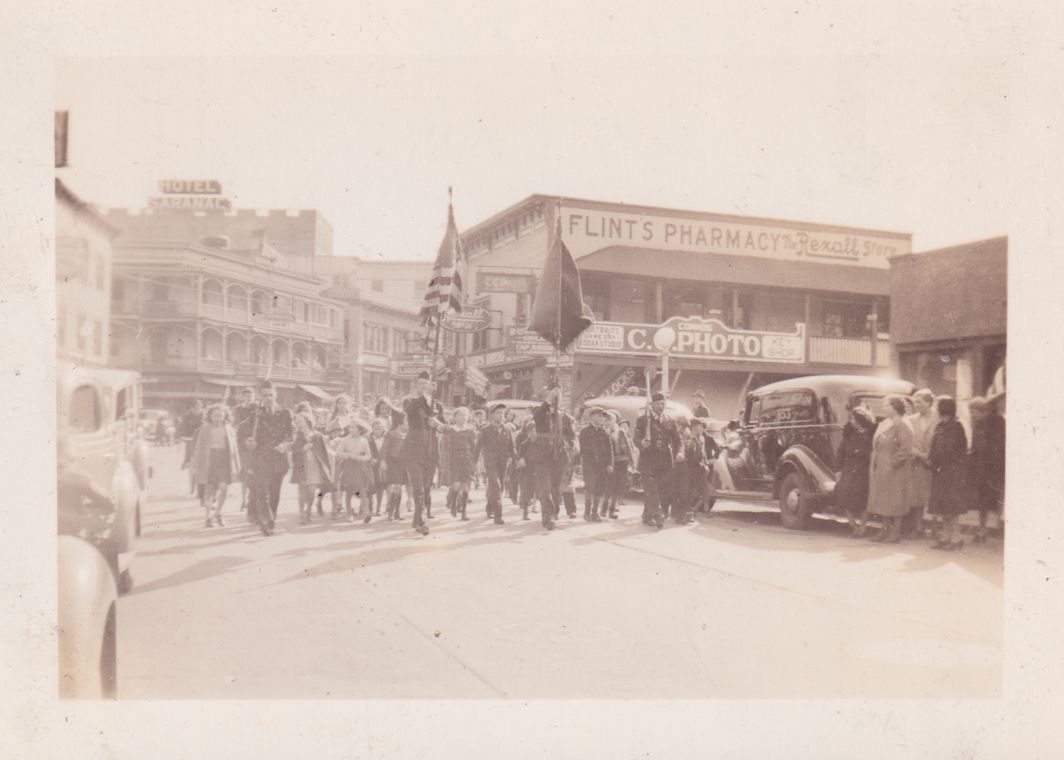 Black and white photograph of a parade on Broadway. There is a group of children marching behind two men holding flags. Flint's Pharmacy and C.C. Photo can be seen in the background.