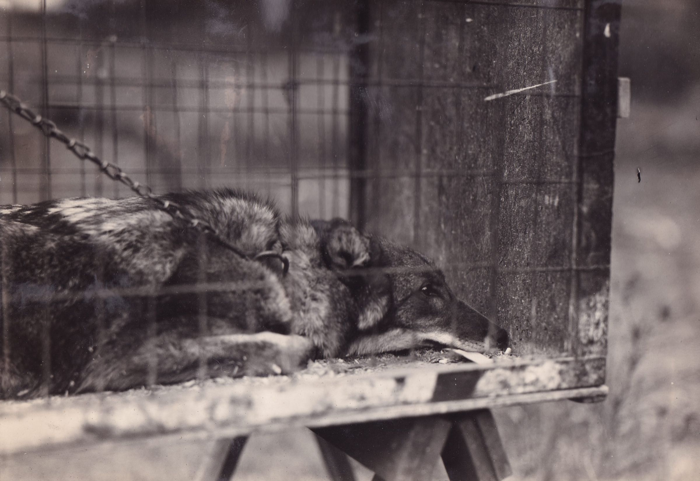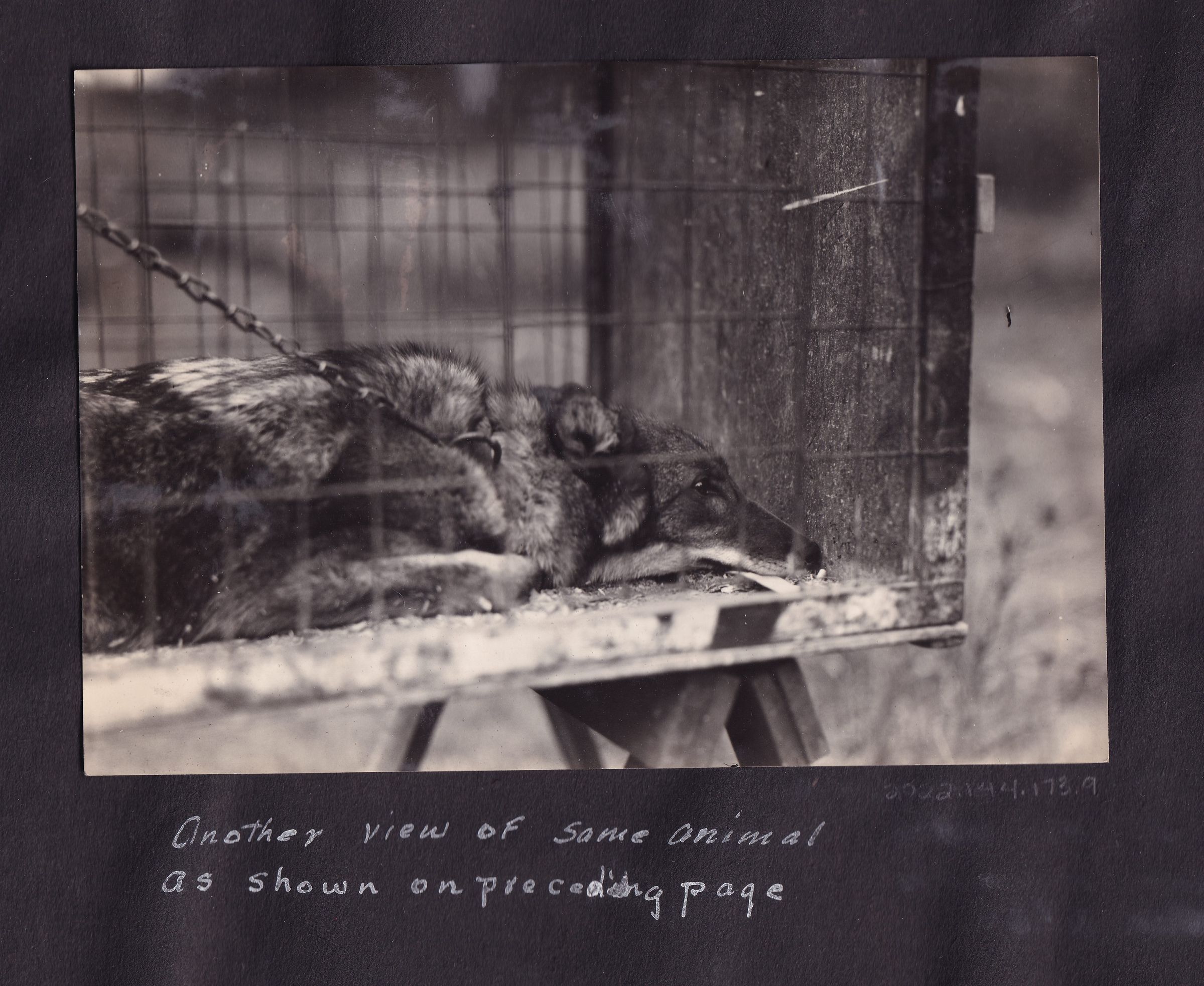 Photograph of a wolf laying down in a cage. The wolf is attached to a taut chain. Handwritten caption under photograph reads, "Another view of same animal as shown on preceding page."