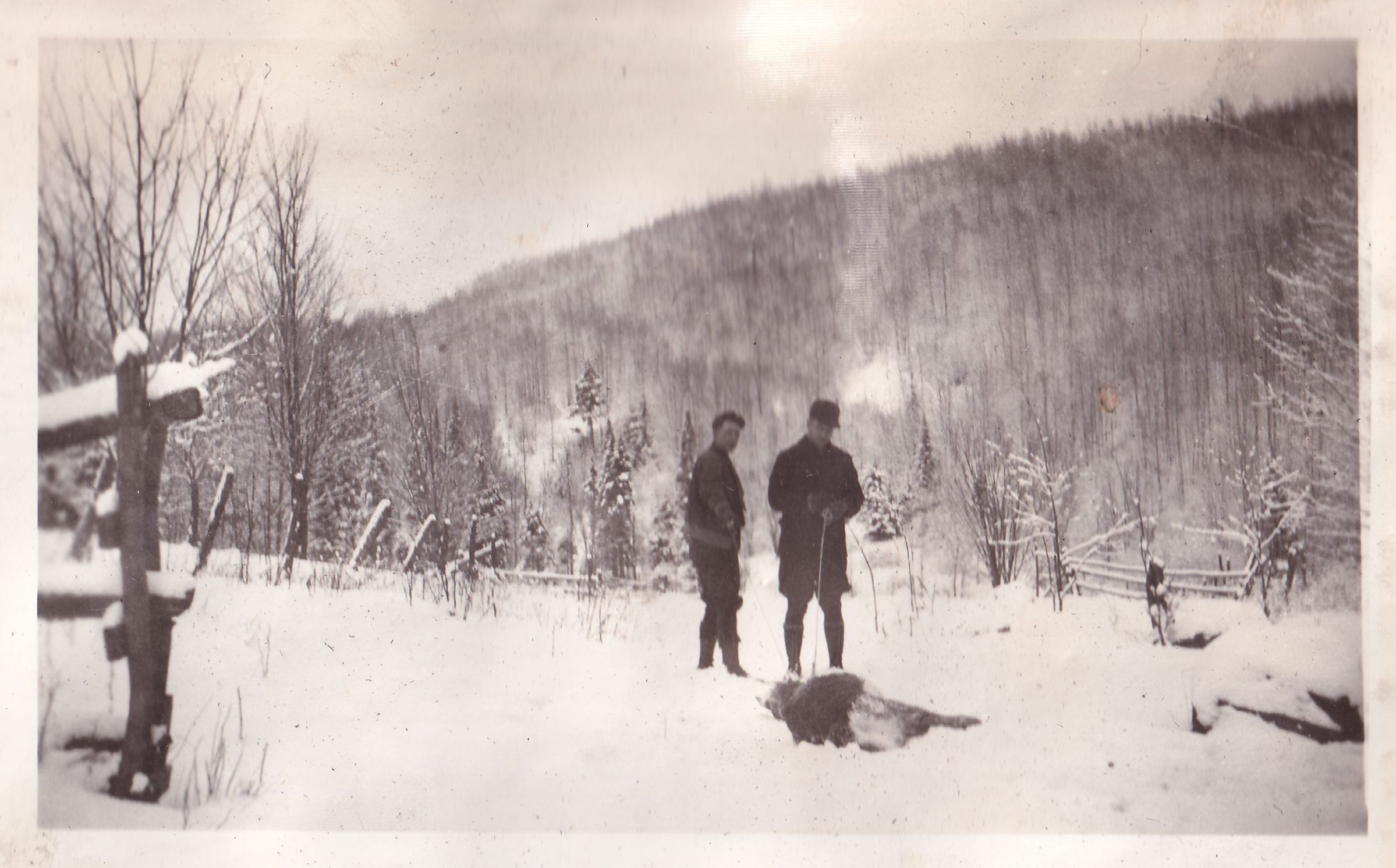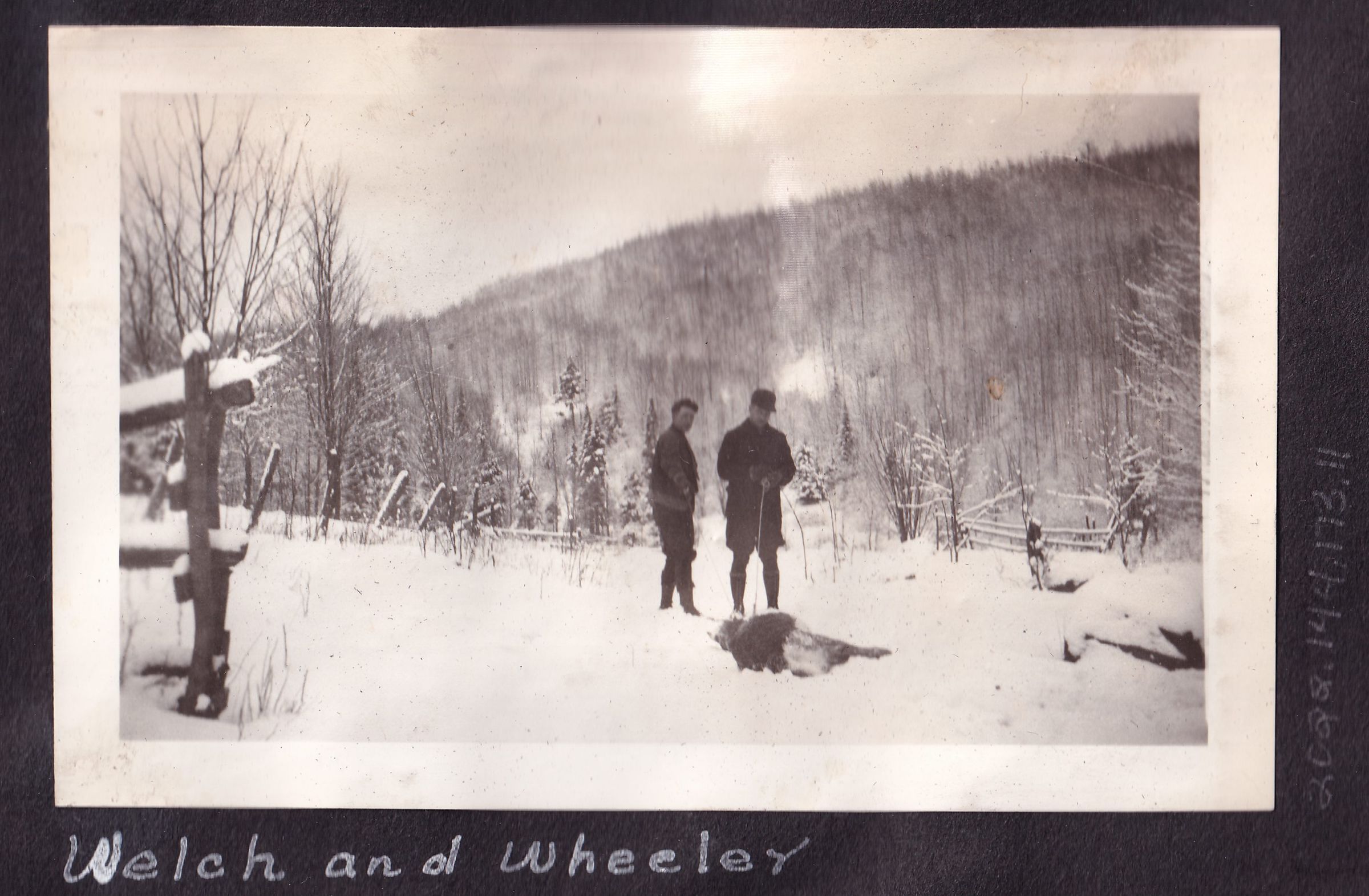 Photograph of two men in game warden uniforms standing in the snow with the carcass of an animal in the snow in front of them. Handwritten caption under photograph reads, "Welch and Wheeler."