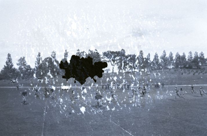 Negative of a football game on a large athletic field with trees in the background. Parts of the image are obscured by bits of paper stuck to the surface of the negative. Most likely taken by Mary Ives Baldwin. This item is not fully cataloged but has been uploaded so the image is publicly available; if you would like us to prioritize cataloging this item, please contact the HSL Collections team.