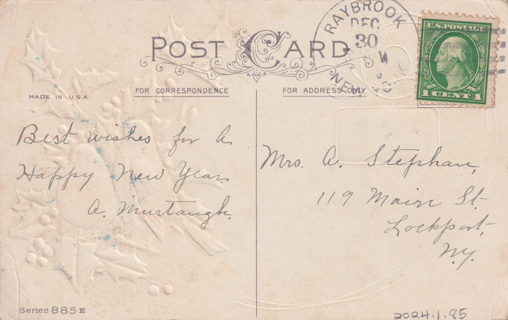 Color postcard with a raised design of two bluebirds amidst holly leaves. A small box shows a group of buildings with smoke rising from the chimneys. Printed message on front reads, "The Blue Birds Bring to You My New Years Greeting." No printer's mark. Used, divided back, postmarked Ray Brook, NY, December 30, [year illegible]. Handwritten message on back reads, "Best wishes for a Happy New Year. A Murtaugh." Mailed to Mrs. A. Stephan, 119 Main St., Lockport, NY.Subject Place