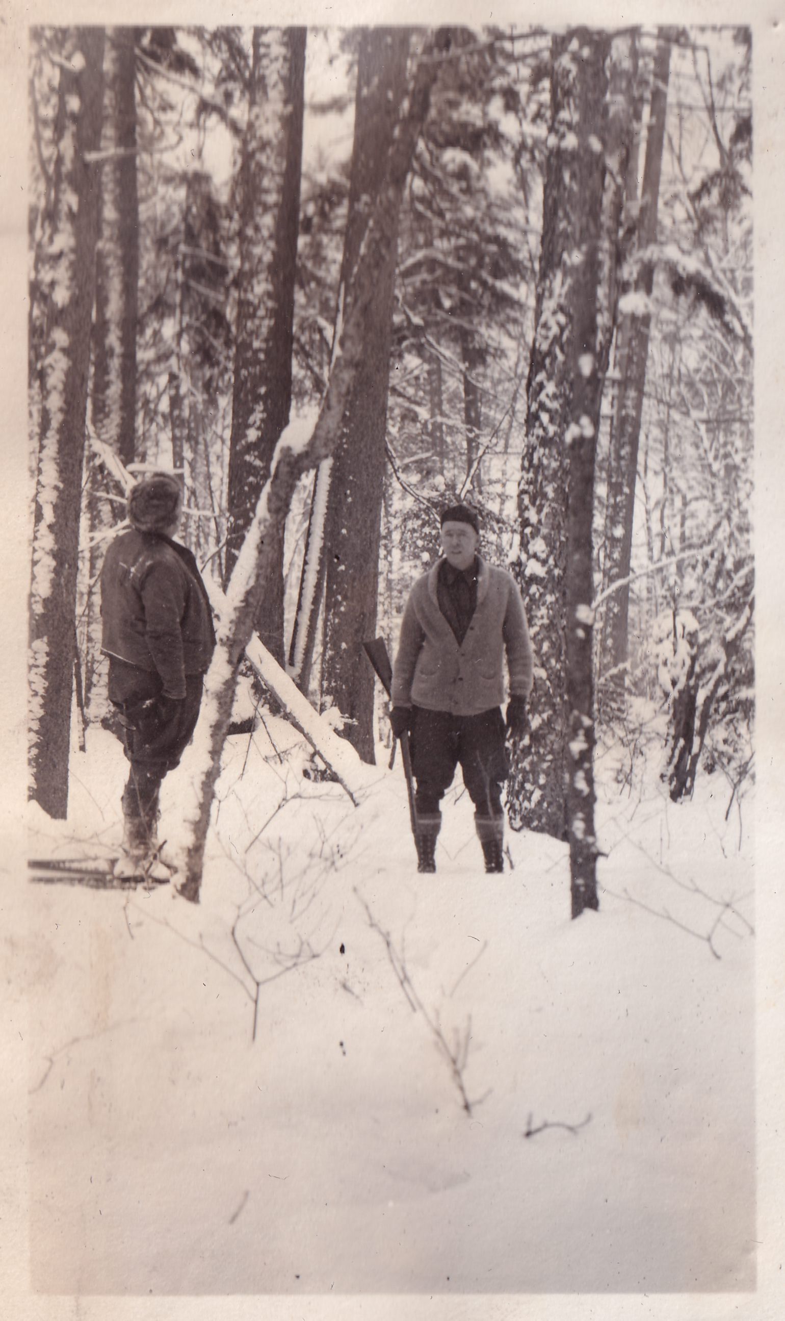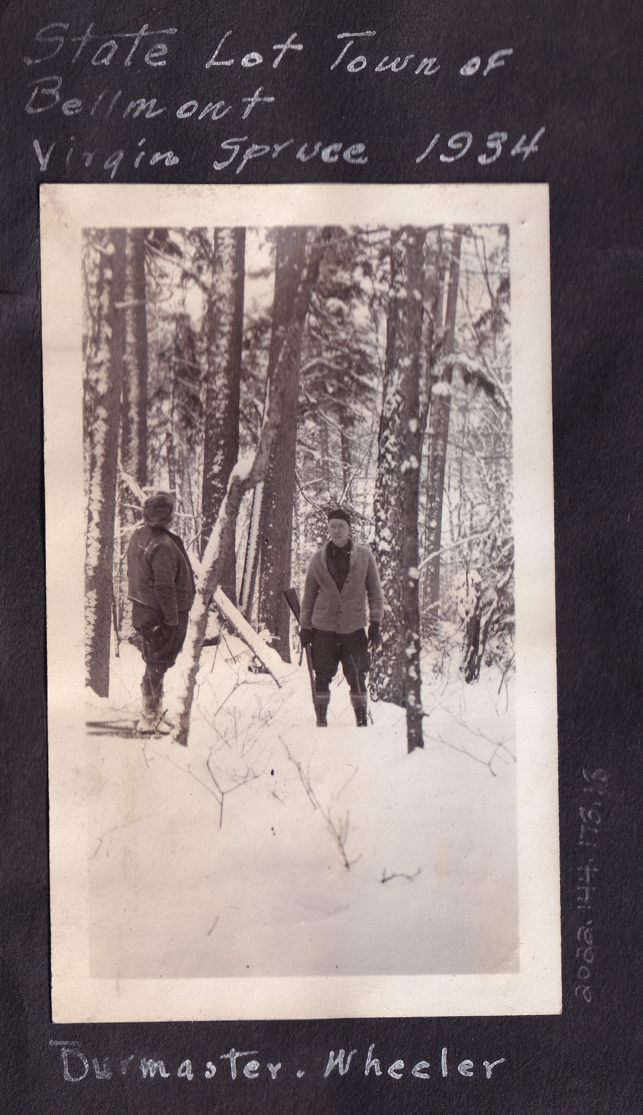 Photograph of two men standing on snowshoes in the woods. The man at right is holding a long gun. Handwritten caption under the photograph reads, "State Lot Town of Bellmont. Virgin Spruce 1934. Burmaster - Wheeler."