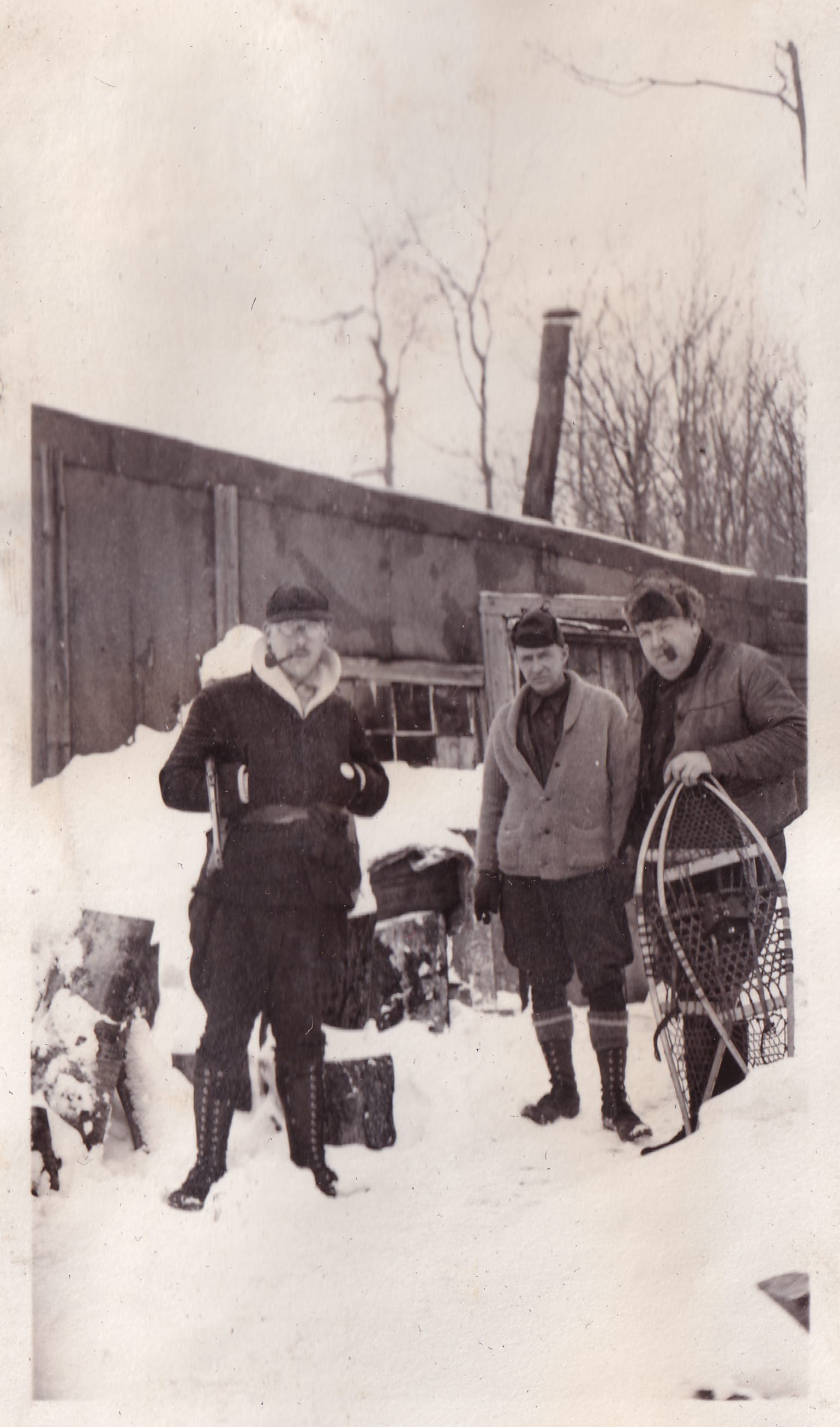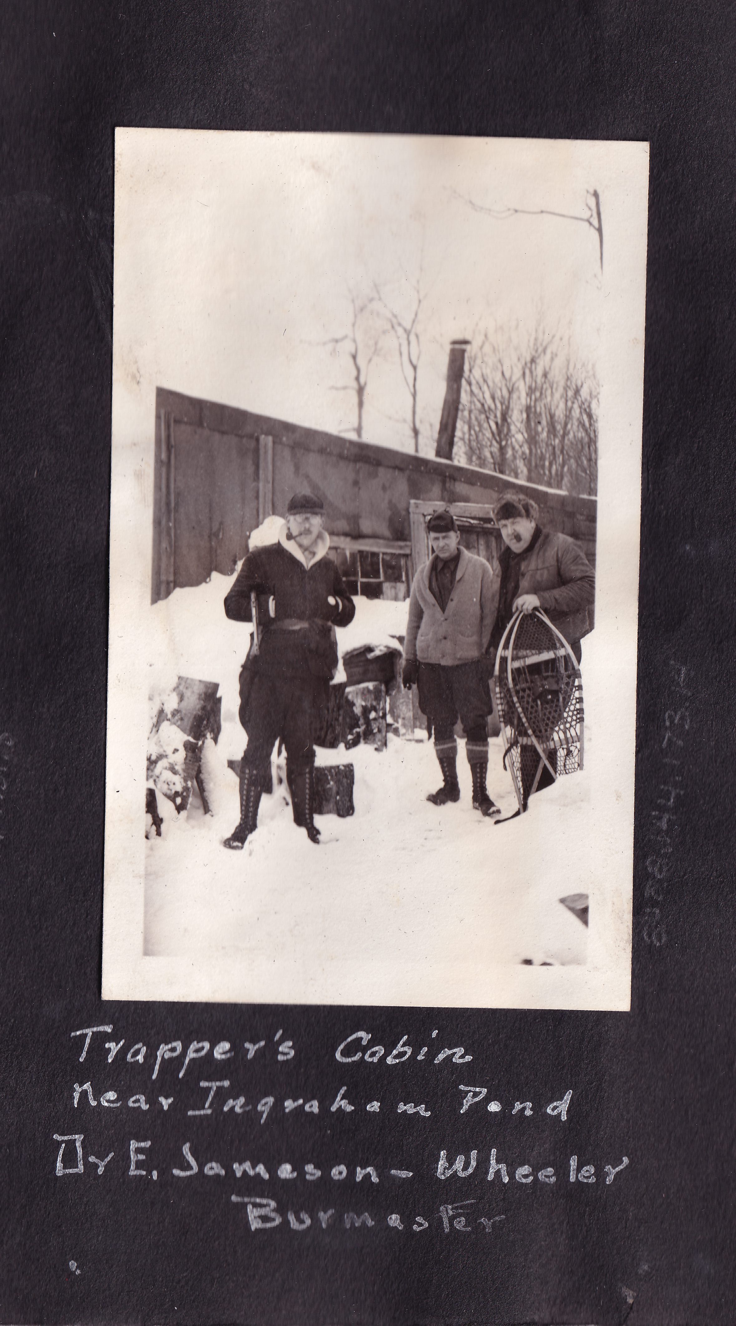 Photograph of three men standing in the snow near a small hunting shack. One man is holding a pair of snowshoes, and two of them have pipes in their mouths. They are all wearing game warden uniforms. Handwritten caption on page reads, "Trapper's Cabin near Ingraham Pond. Dr. E. Jameson - Wheeler - Burmaster."