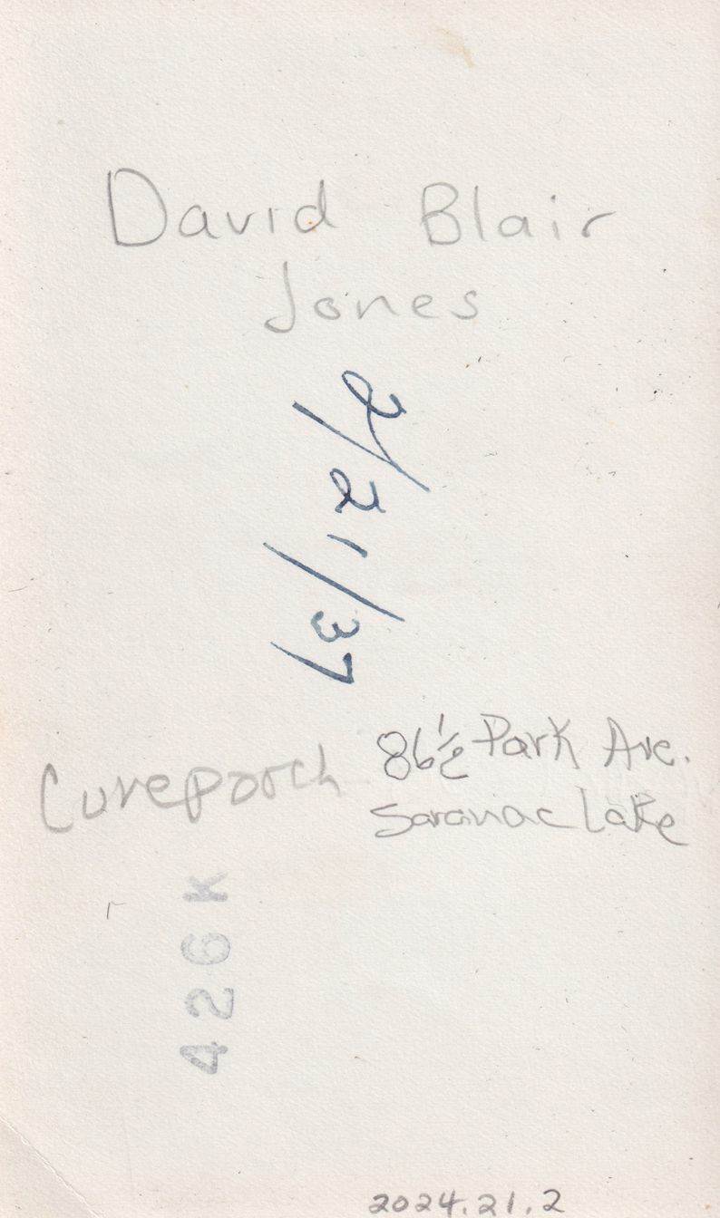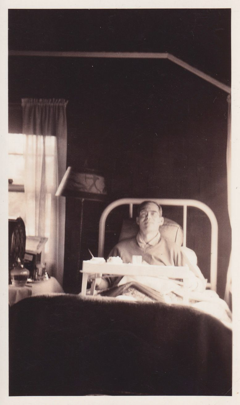 Black-and-White photograph of David Blair Jones sitting up in bed. There is a tray with legs over his lap. Handwritten caption on back reads, "2/21/37." Different handwritten note reads, "David Blair Jones, cure porch 86 1/2 Park Ave., Saranac Lake."