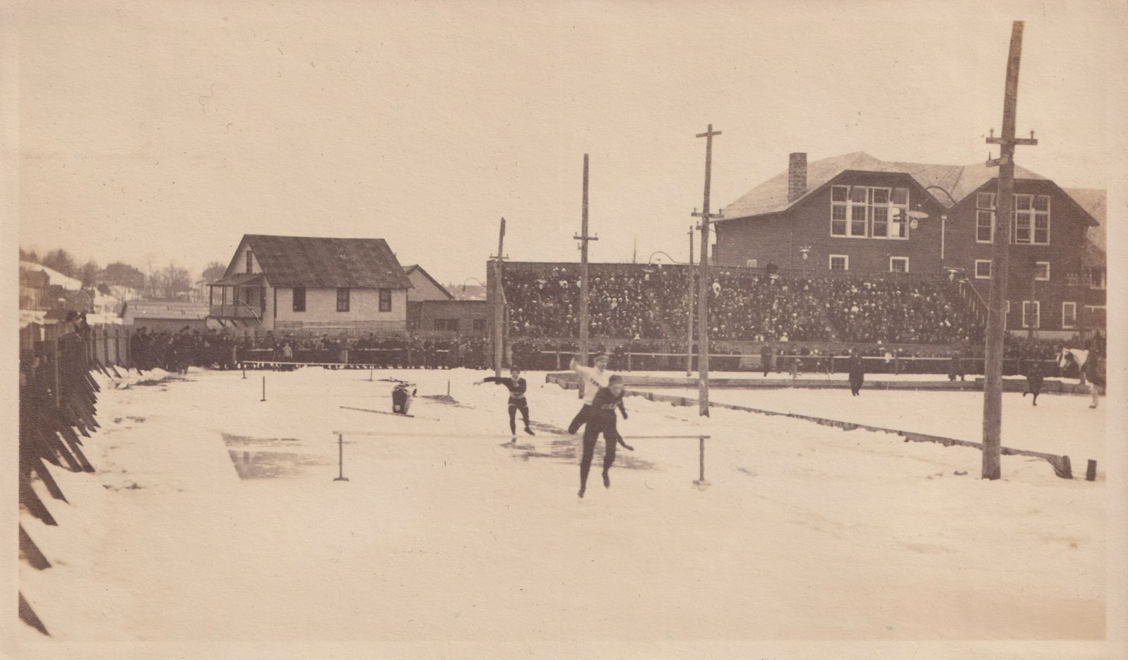 Black-and-white photograph of at least four men competing in an outdoor ice skating hurdles competition. There is a crowd at the edge of the racing rink.