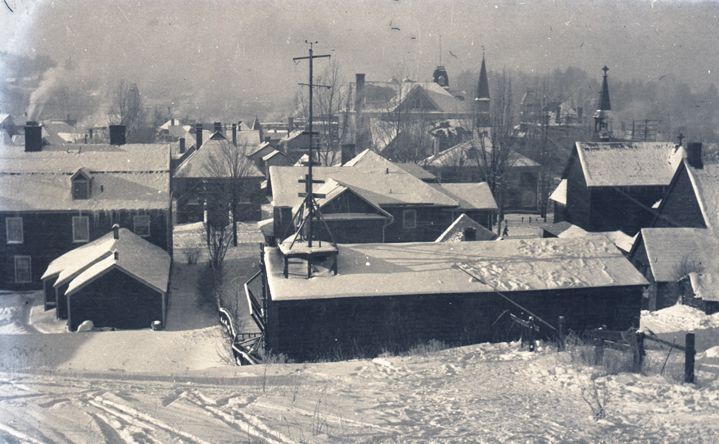 Negative of the snow-covered roofs of houses and buildings on Church Street, most likely taken from the corner of Prescott Place. Most likely taken by Mary Ives Baldwin. This item is not fully cataloged but has been uploaded so the image is publicly available; if you would like us to prioritize cataloging this item, please contact the HSL Collections team.