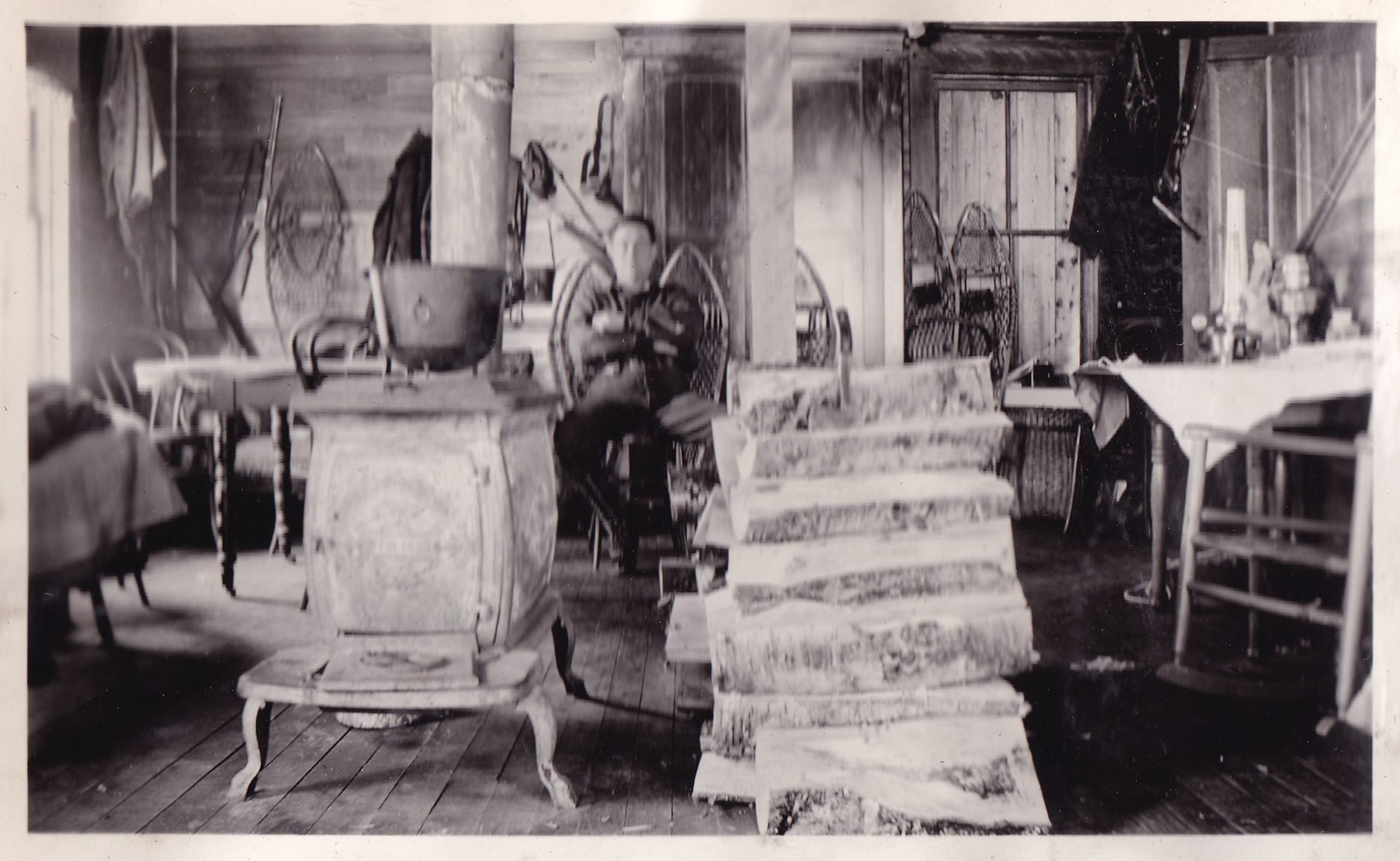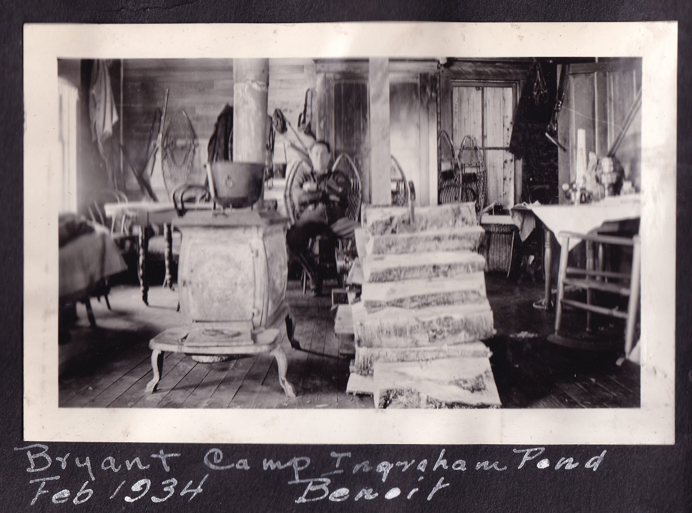 Photograph of the interior of a hunting camp. There is a wood-burning stove at the center of the room with a stack of logs next to it. A man is seated at the back of the room looking between the stove and the wood pile. Chairs, tables, and a bed can be seen around the room, and there are snowshoes and long guns hanging on the walls. Handwritten caption on page reads, "Bryant Camp, Ingraham Pond. Feb. 1934. Benoit."Lexicon