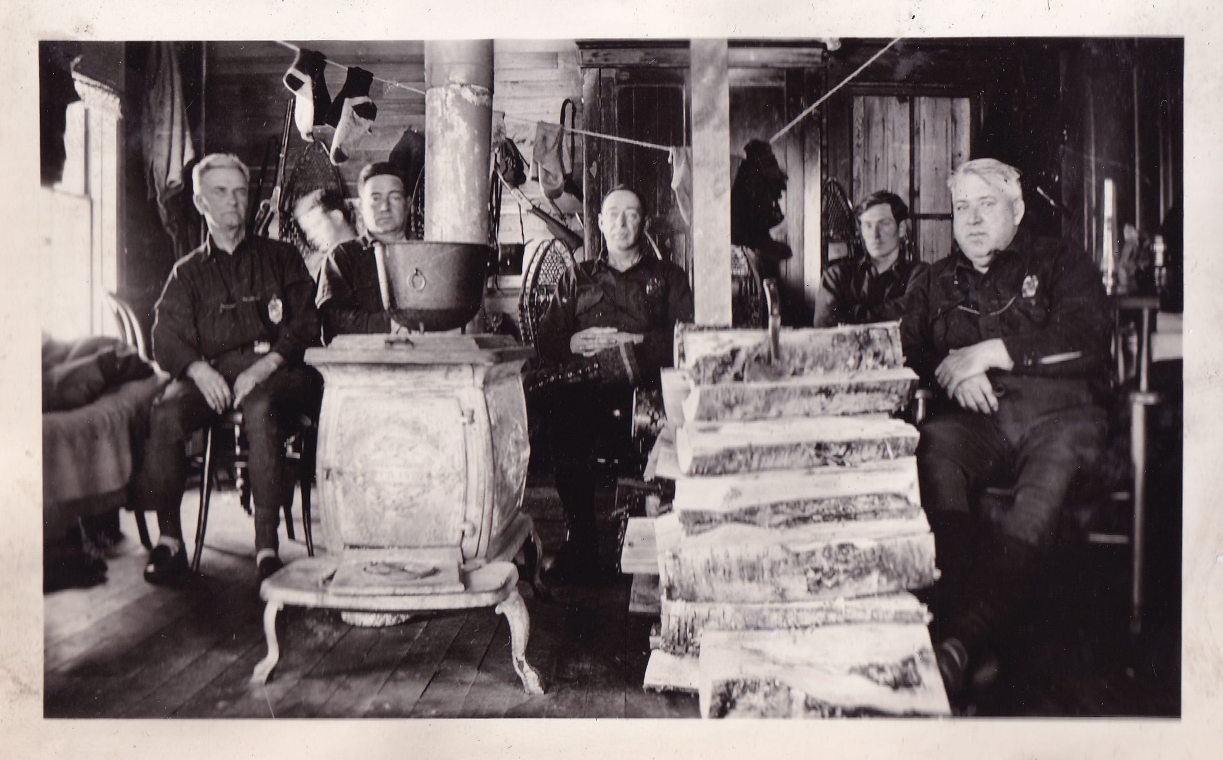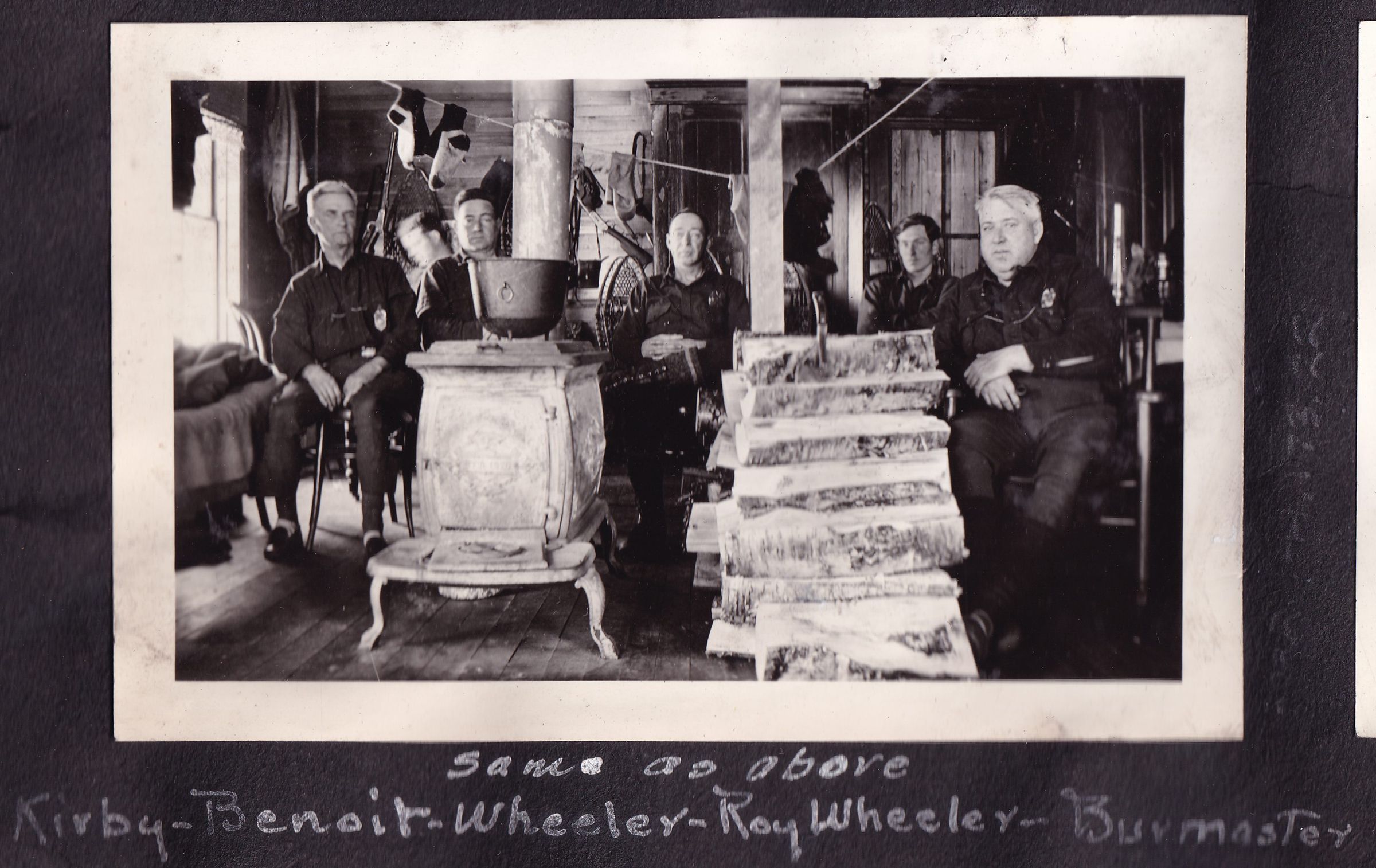 Photograph of the interior of a hunting camp. There are six men seated around a wood burning stove with a pile of logs next to it. Socks can be seen hanging on a clothesline around it. Handwritten caption on page reads, "Same as Above [Bryant Camp, Ingraham Pond]. Kirby - Benoit - Wheeler - Roy Wheeler - Burmaster."