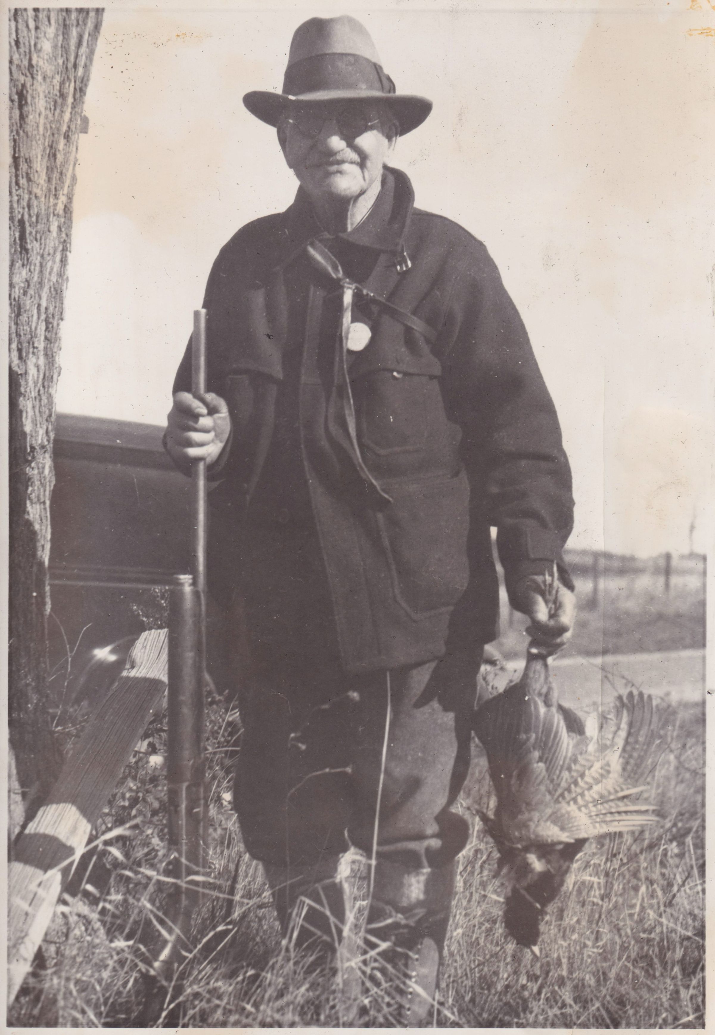 Black-and-White photograph an unidentified man holding a rifle and a dead game bird.