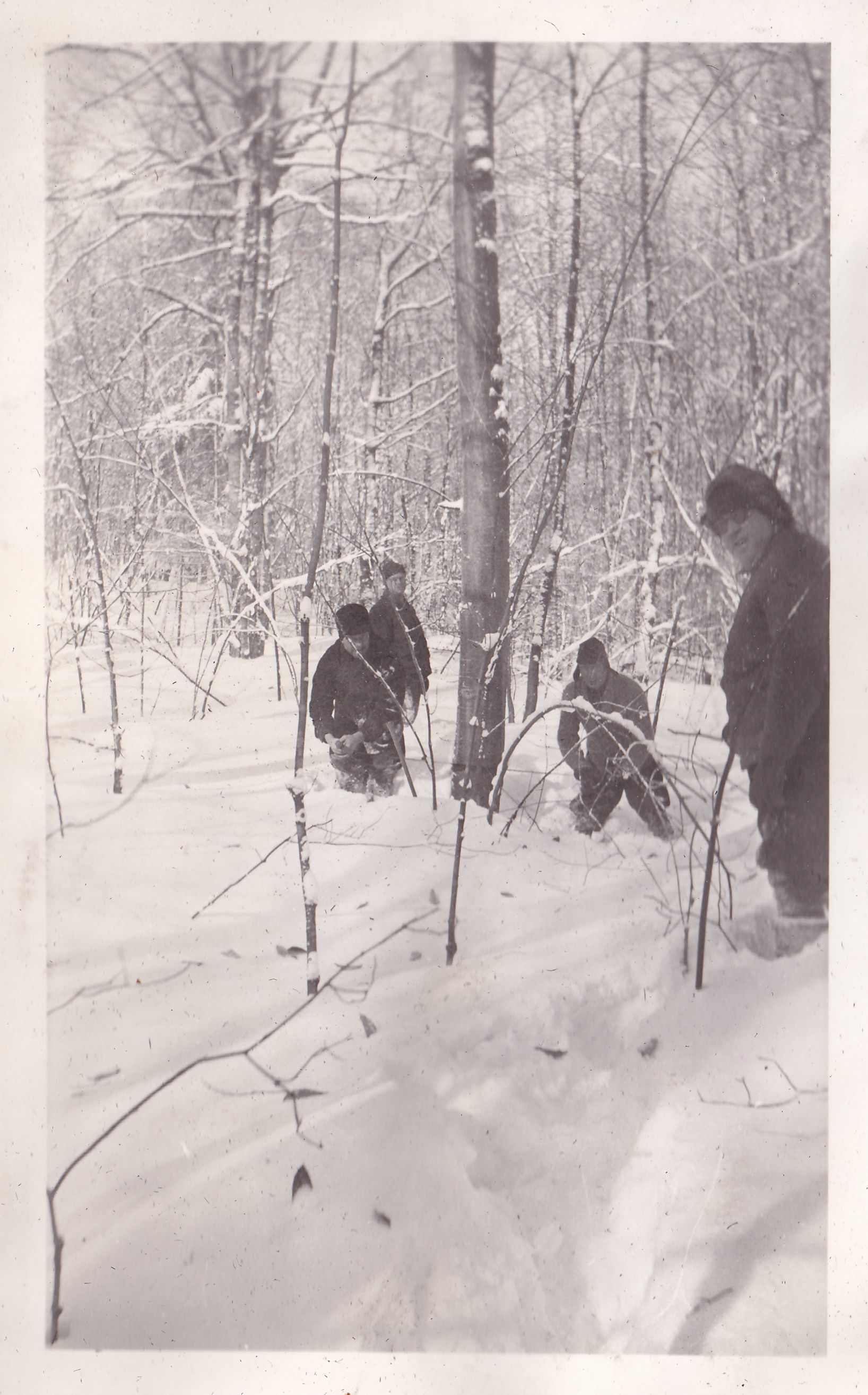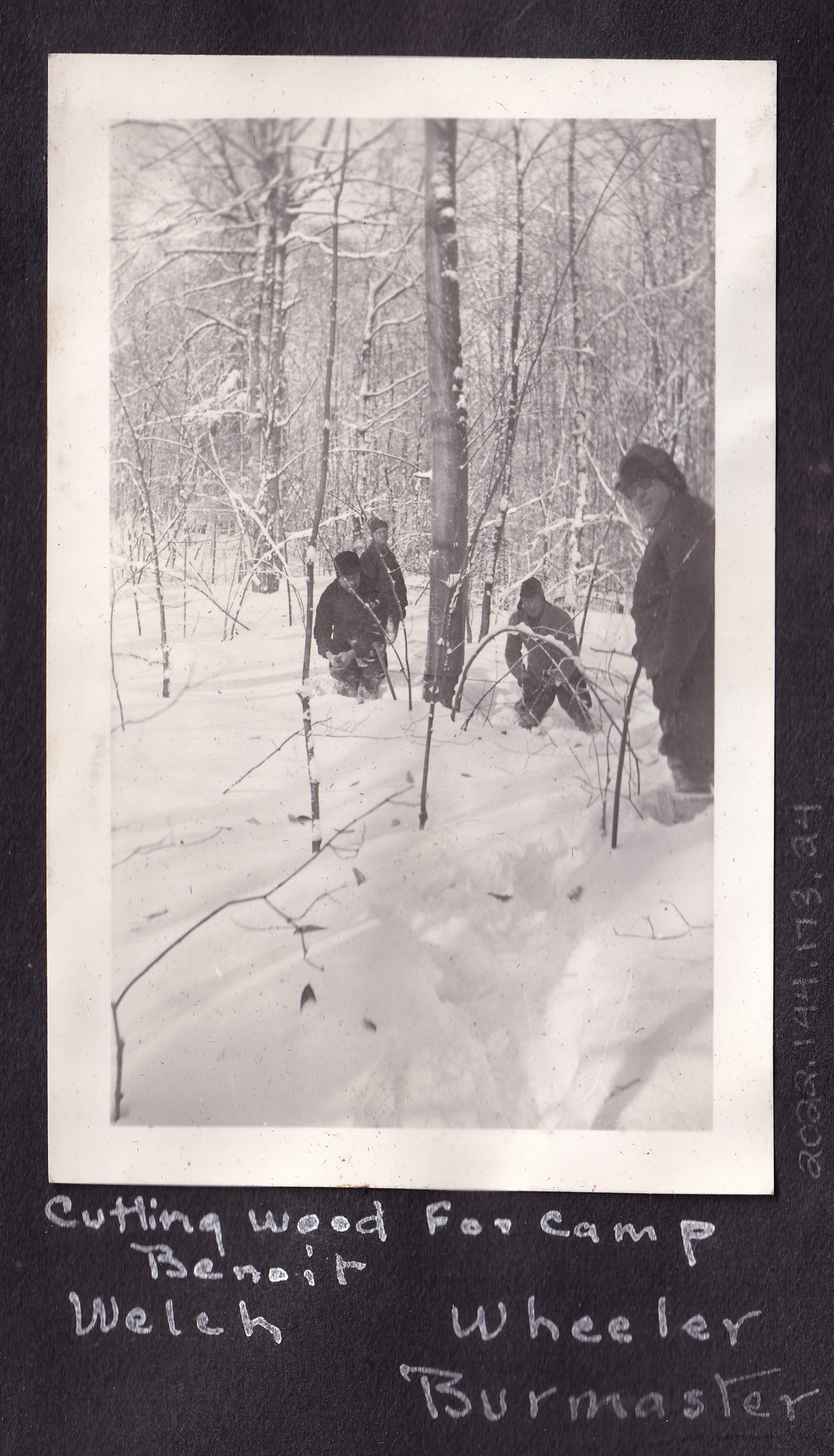 Photograph of four men standing in deep snow in the woods. Two of them are using a crosscut saw to cut down a tree. Handwritten caption on page reads, "Cutting Wood for Camp. Benoit - Welch - Wheeler - Burmaster."