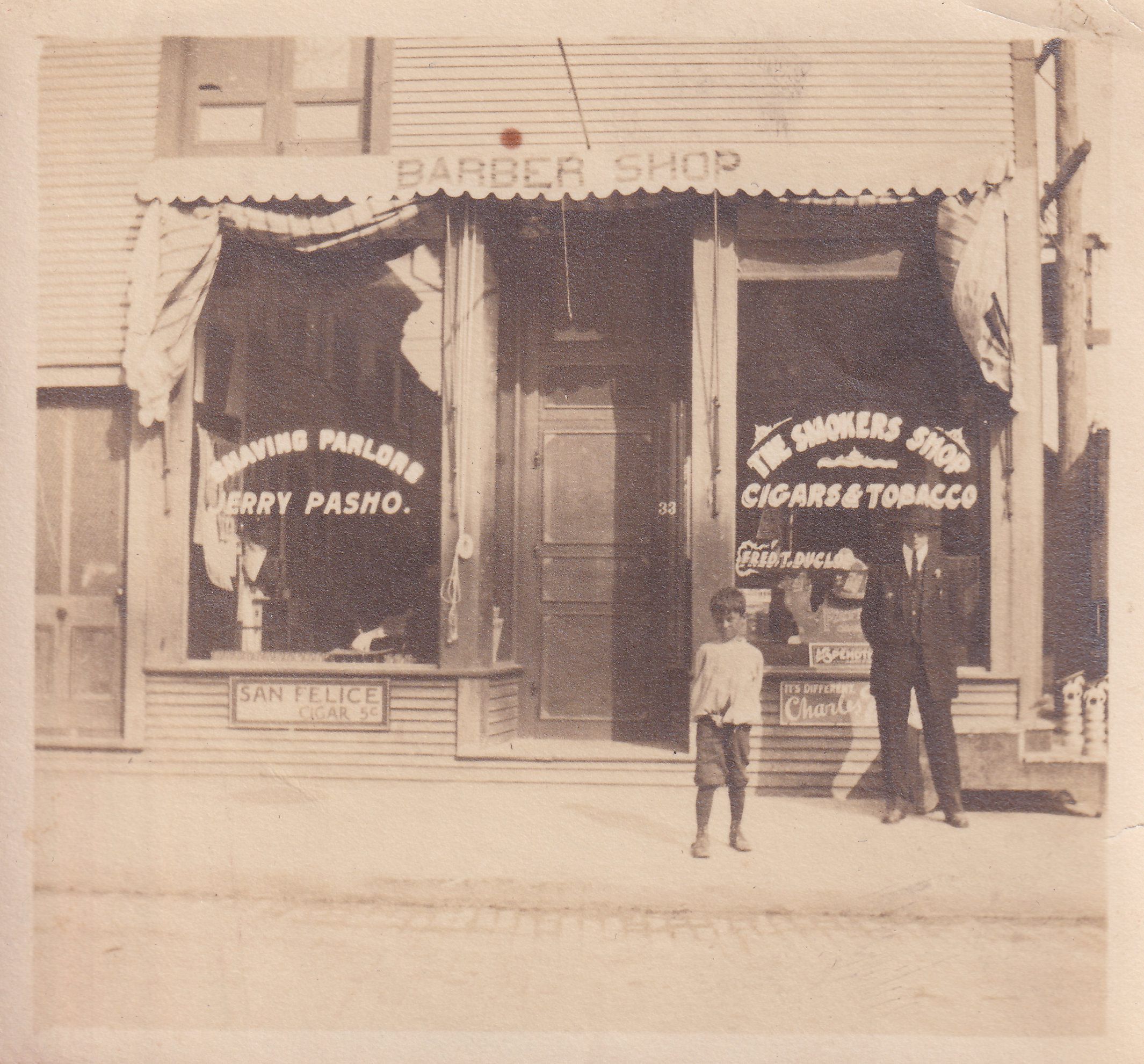 Photograph of an unidentified young boy and man standing in front of 33 Main Street. The awning above the store reads, "Barber Shop," and the windows read, "Shaving Parlors - Jerry Pasho," and "The Smokers Shop - Cigars & Tobacco - Fred T. Duclo."Photograph Details