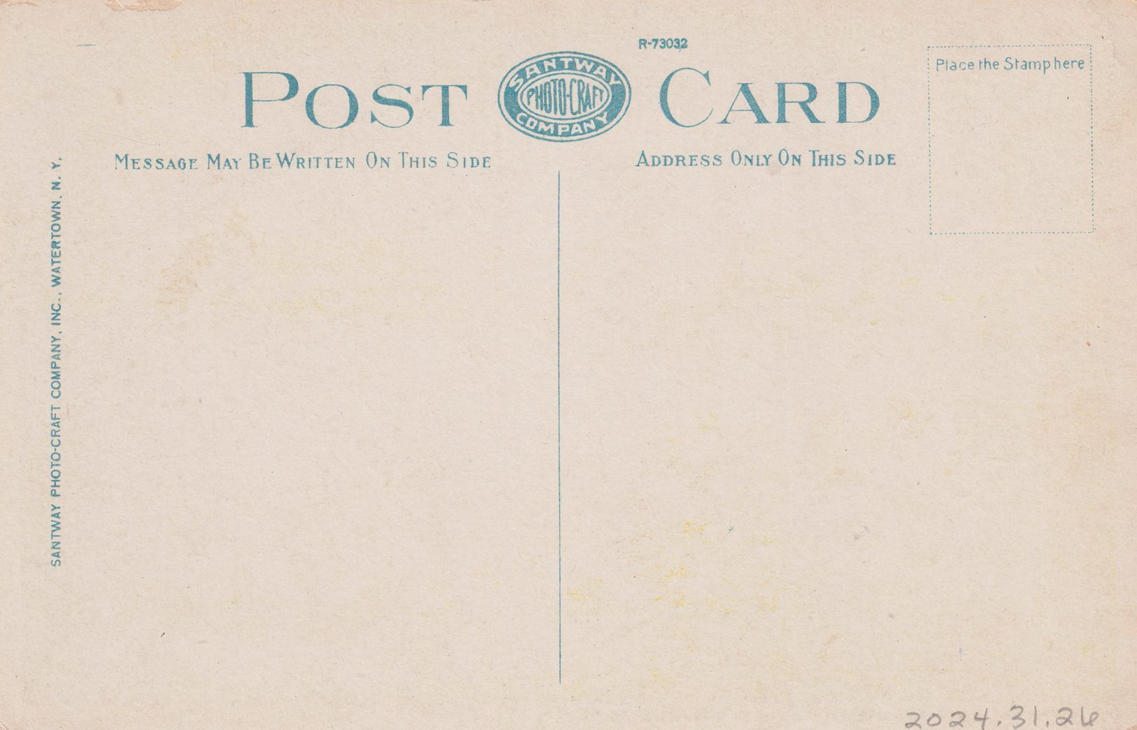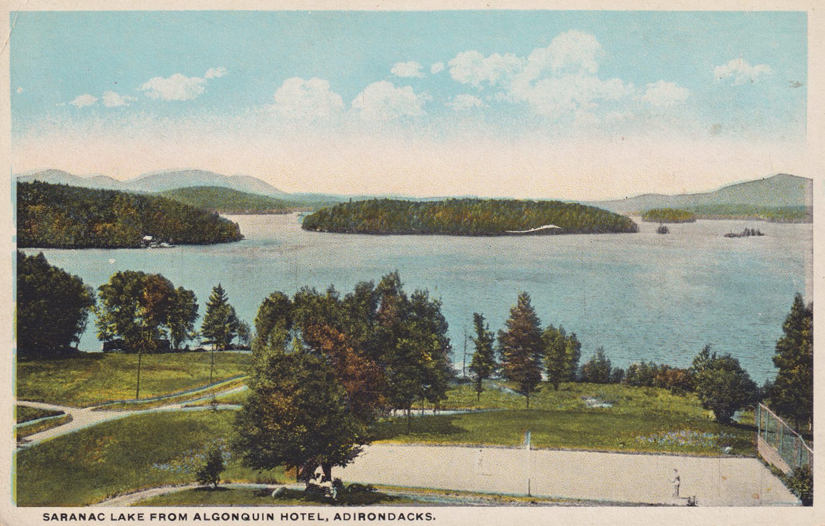 Color postcard showing the view of Lower Saranac Lake from the Algonquin Hotel. A tennis court is visible in the foreground. Printed caption on front reads, "Saranac Lake from Algonquin Hotel, Adirondacks." Printed by the Santway Photo-Craft Company, Inc., Watertown, NY. Unused, divided back, white border.Subject Place