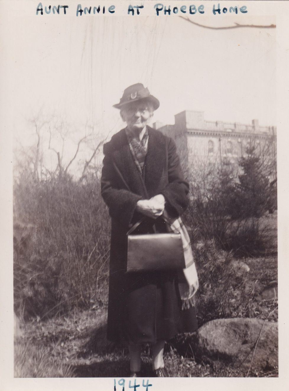 Black-and-White photograph of an unidentified woman standing on the grounds at "Phoebe Home." A large stone or brick building can be seen in the distance. Handwritten caption on front reads, "Aunt Annie at Phoebe Home, 1944."